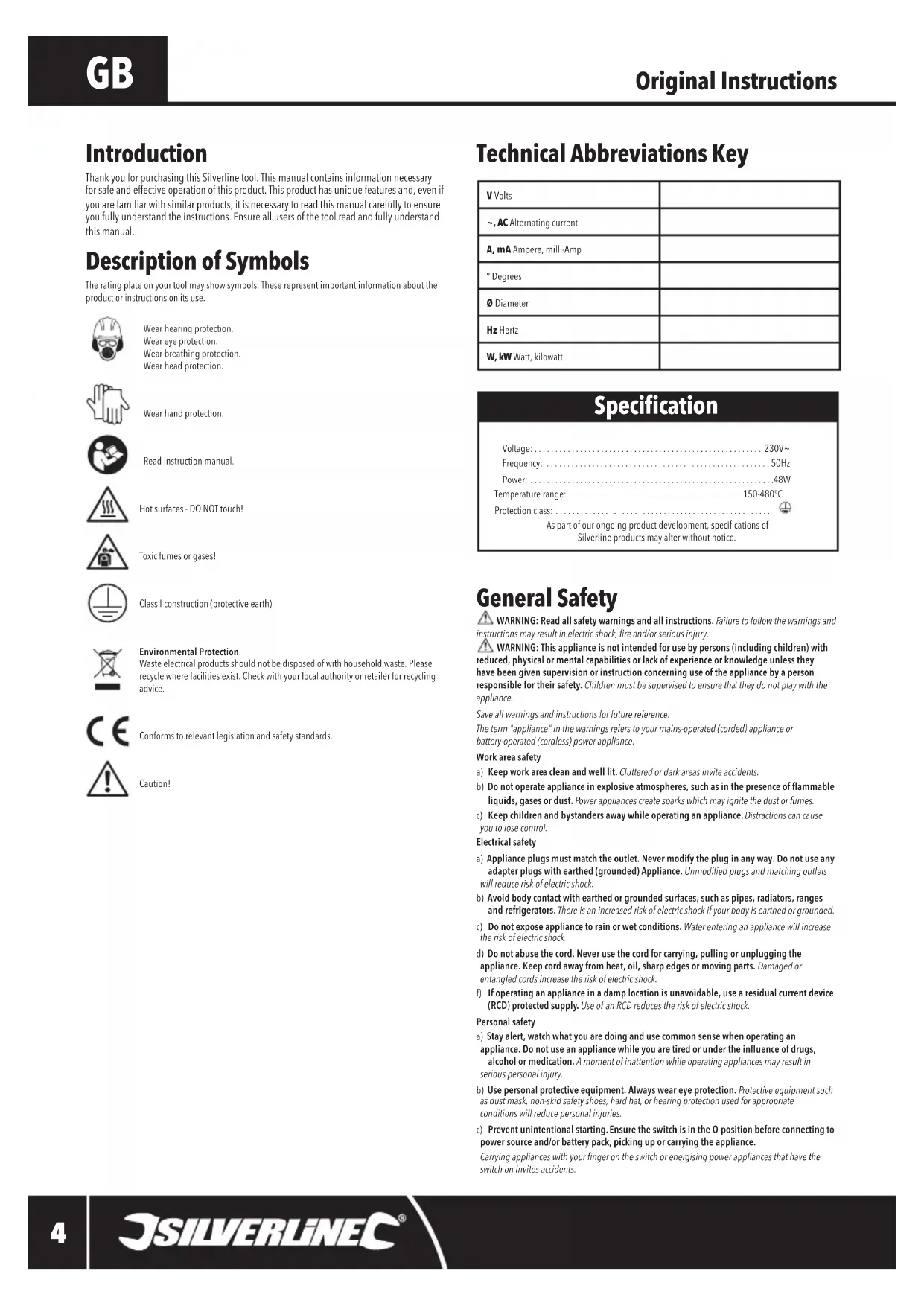 instructions may result in electric shock, re and/or serious injury. WARNING: This appliance is not intended for use by persons (including children) with reduced, physical or mental capabilities or lack of experience or knowledge unless they have been given supervision or instruction concerning use of the appliance by a person responsible for their safety. Children must be supervised to ensure that they do not play with the appliance.Save all warnings and instructions for future reference. The term "appliance" in the warnings refers to your mains-operated (corded) appliance or battery-operated (cordless) power appliance.Work area safety a) Keep work area clean and well lit. Cluttered or dark areas invite accidents. b) Do not operate appliance in explosive atmospheres, such as in the presence of ammable liquids, gases or dust. Power appliances create sparks which may ignite the dust or fumes. c) Keep children and bystanders away while operating an appliance. Distractions can cause you to lose control.Electrical safetya) Appliance plugs must match the outlet. Never modify the plug in any way. Do not use any adapter plugs with earthed (grounded) Appliance. Unmodied plugs and matching outlets will reduce risk of electric shock.b) Avoid body contact with earthed or grounded surfaces, such as pipes, radiators, ranges and refrigerators. There is an increased risk of electric shock if your body is earthed or grounded. c) Do not expose appliance to rain or wet conditions. Water entering an appliance will increase the risk of electric shock.d) Do not abuse the cord. Never use the cord for carrying, pulling or unplugging the appliance. Keep cord away from heat, oil, sharp edges or moving parts. Damaged or entangled cords increase the risk of electric shock. f) If operating an appliance in a damp location is unavoidable, use a residual current device (RCD) protected supply. Use of an RCD reduces the risk of electric shock. Personal safetya) Stay alert, watch what you are doing and use common sense when operating an appliance. Do not use an appliance while you are tired or under the inuence of drugs, alcohol or medication. A moment of inattention while operating appliances may result in serious personal injury. b) Use personal protective equipment. Always wear eye protection. Protective equipment such as dust mask, non-skid safety shoes, hard hat, or hearing protection used for appropriate conditions will reduce personal injuries. c) Prevent unintentional starting. Ensure the switch is in the O-position before connecting to power source and/or battery pack, picking up or carrying the appliance. Carrying appliances with your nger on the switch or energising power appliances that have the switch on invites accidents. Description of Symbols The rating plate on your tool may show symbols. These represent important information about the product or instructions on its use.Wear hearing protection. Wear eye protection. Wear breathing protection.Wear head protection.Wear hand protection.Read instruction manual.Hot surfaces - DO NOT touch!Toxic fumes or gases!Class I construction (protective earth)Environmental Protection Waste electrical products should not be disposed of with household waste. Please recycle where facilities exist. Check with your local authority or retailer for recycling advice.Conforms to relevant legislation and safety standards.Caution! Introduction Thank you for purchasing this Silverline tool. This manual contains information necessary for safe and effective operation of this product. This product has unique features and, even if you are familiar with similar products, it is necessary to read this manual carefully to ensure you fully understand the instructions. Ensure all users of the tool read and fully understand this manual. Original Instructions V Volts~, AC Alternating currentA, mA Ampere, milli-Amp° DegreesØ DiameterHz HertzW, kW Watt, kilowatt 265829 Manual.indd 4 16/11/2017 09:59Soldering Station 48W265829