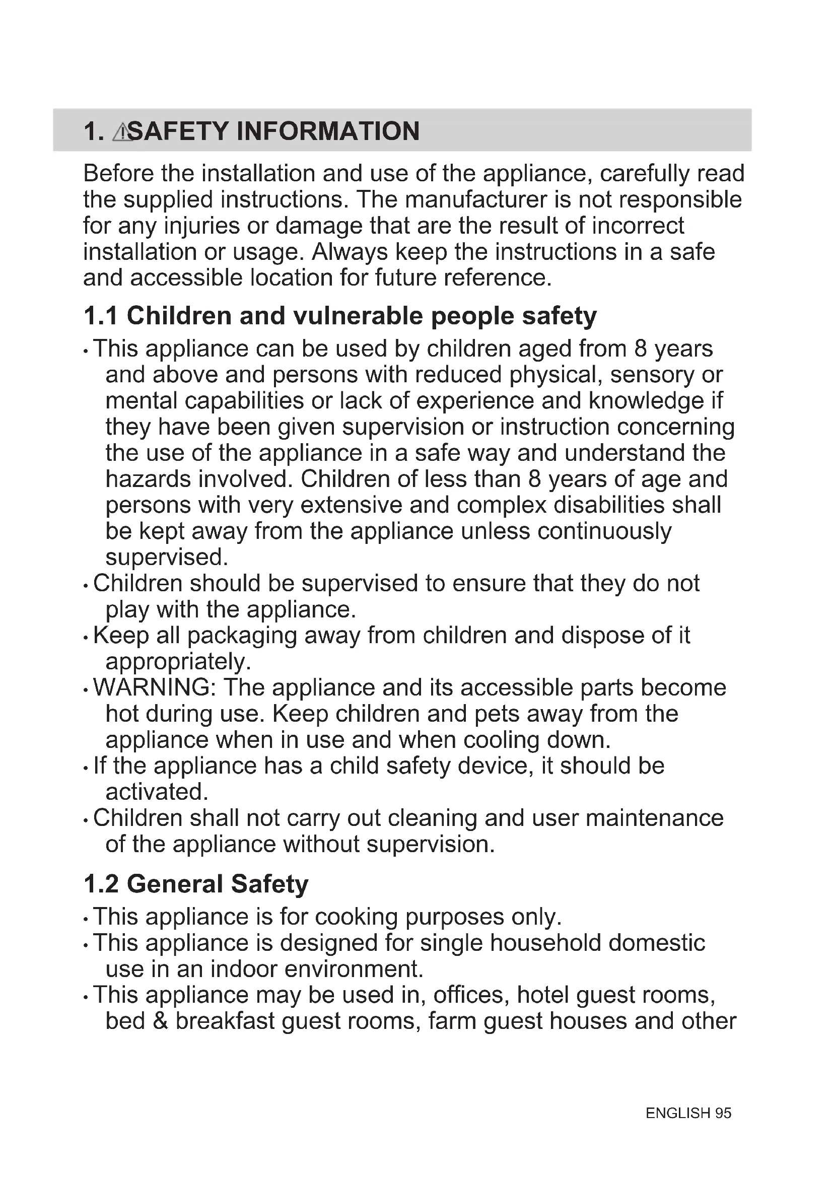 - This appliance can be used by children aged from 8 years and above and persons with reduced physical, sensory or mental capabilities or lack of experience and knowledge if they have been given supervision or instruction concerning the use of the appliance in a safe way and understand the hazards involved. Children of less than 8 years of age and persons with very extensive and complex disabilities shall be kept away from the appliance unless continuously supervised.