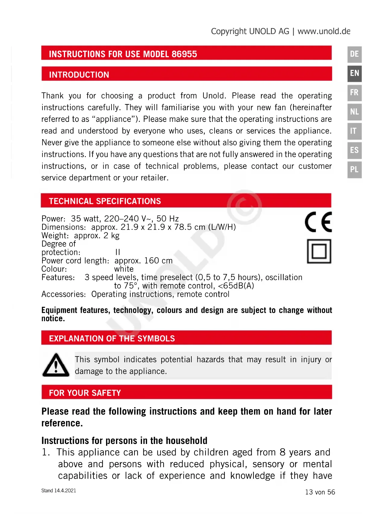 Power: 35 watt, 220–240 V~, 50 Hz Dimensions: approx. 21.9 x 21.9 x 78.5 cm (L/W/H) Weight: approx. 2 kg Degree of protection: II Power cord length: approx. 160 cm Colour: white Features: 3 speed levels, time preselect (0,5 to 7,5 hours), oscillation to 75°, with remote control, <65dB(A) Accessories: Operating instructions, remote control Equipment features, technology, colours and design are subject to change without notice. INTRODUCTION Thank you for choosing a product from Unold. Please read the operating instructions carefully. They will familiarise you with your new fan (hereinafter referred to as “appliance”). Please make sure that the operating instructions are read and understood by everyone who uses, cleans or services the appliance. Never give the appliance to someone else without also giving them the operating instructions. If you have any questions that are not fully answered in the operating instructions, or in case of technical problems, please contact our customer service department or your retailer. Copyright UNOLD AG | www.unold.de UNOLD ©14 von 56 Stand 14.4.2021