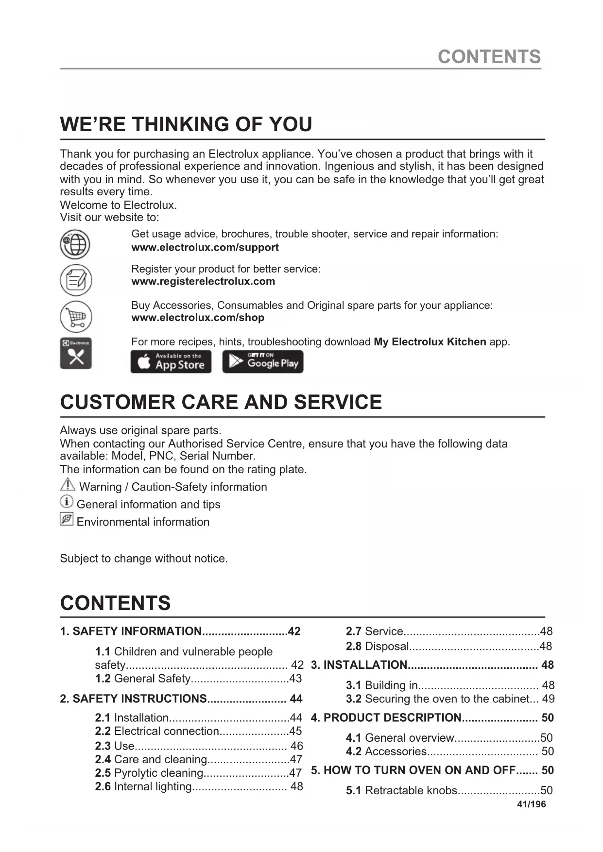 Always use original spare parts. When contacting our Authorised Service Centre, ensure that you have the following data available: Model, PNC, Serial Number. The information can be found on the rating plate. Warning / Caution-Safety information General information and tips Environmental information Subject to change without notice. CONTENTS