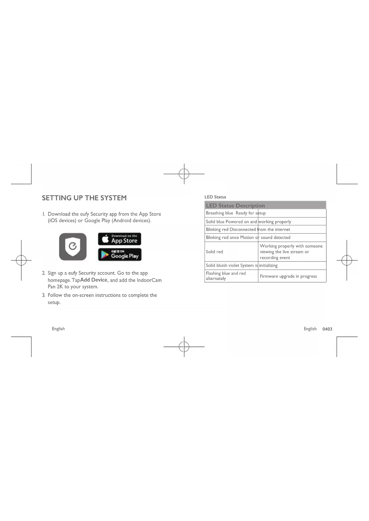 Anker Innovations Limited. All rights reserved. eufy Security and eufy Security Logo are trademarks of Anker Innovations Limited, registered in the United States and other countries. All other trademarks are the property of their respective owners. 51005002646 V01 QUICK START GUIDE Indoor Cam 2K Pan & TiltTable of Contents What’s included 01 Product overview 02 Setting up the system 03 Mounting the indoor cam 05 Powering on the indoor cam 10 HomeKit Statement 10 Notice 11 Customer service 16 English 01 Deutsch 17 Español 32 Français 47 Italiano 62 Nederlands 77