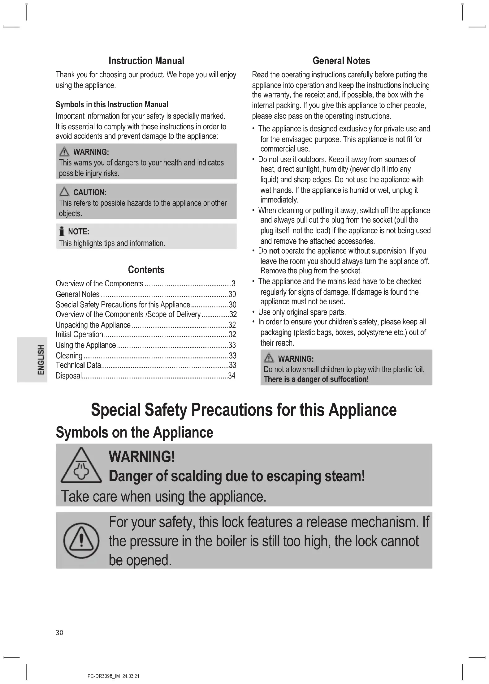 Do not allow small children to play with the plastic foil. There is a danger of suffocation! Special Safety Precautions for this Appliance Symbols on the Appliance WARNING! Danger of scalding due to escaping steam! Take care when using the appliance. For your safety, this lock features a release mechanism. If the pressure in the boiler is still too high, the lock cannot be opened.PC-DR3098_IM 24.03.21