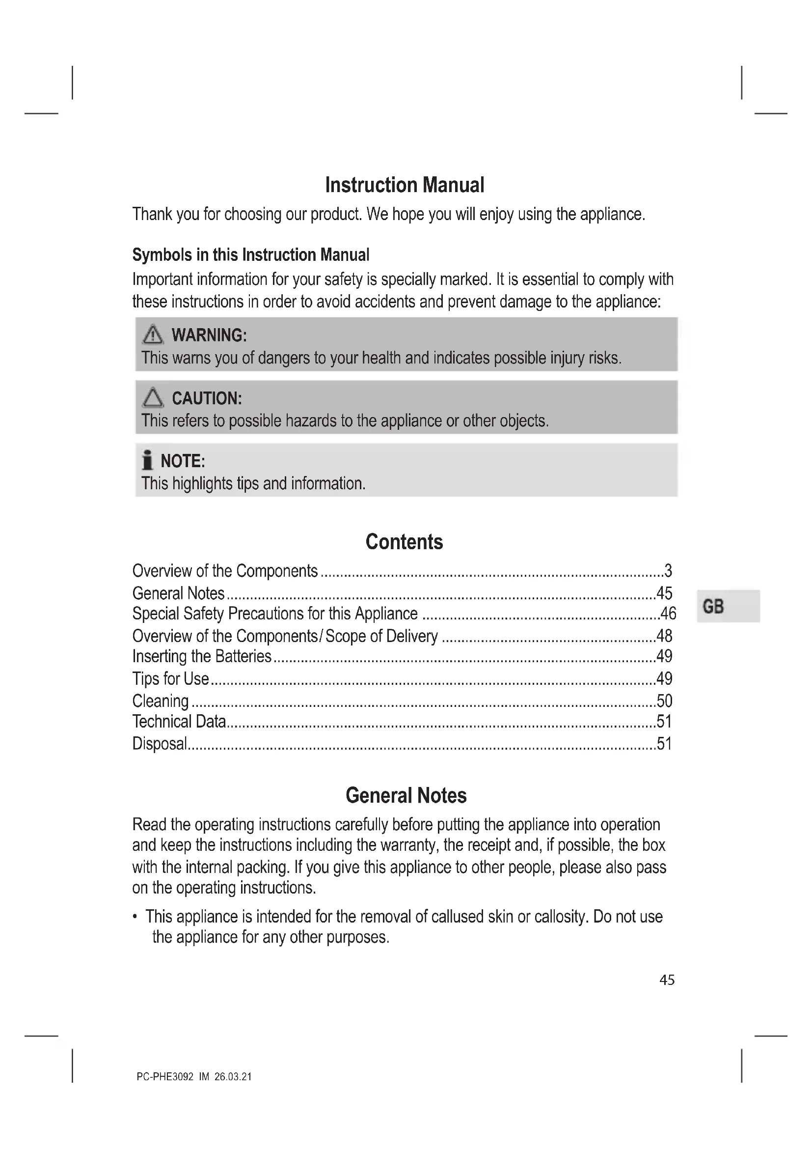 Only use this appliance on the feet, the palms of the hands or on the elbows! If used on other parts of the body, hair could get entangled by the roll and cause injuries.47 PC-PHE3092_IM 26.03.21 CAUTION: