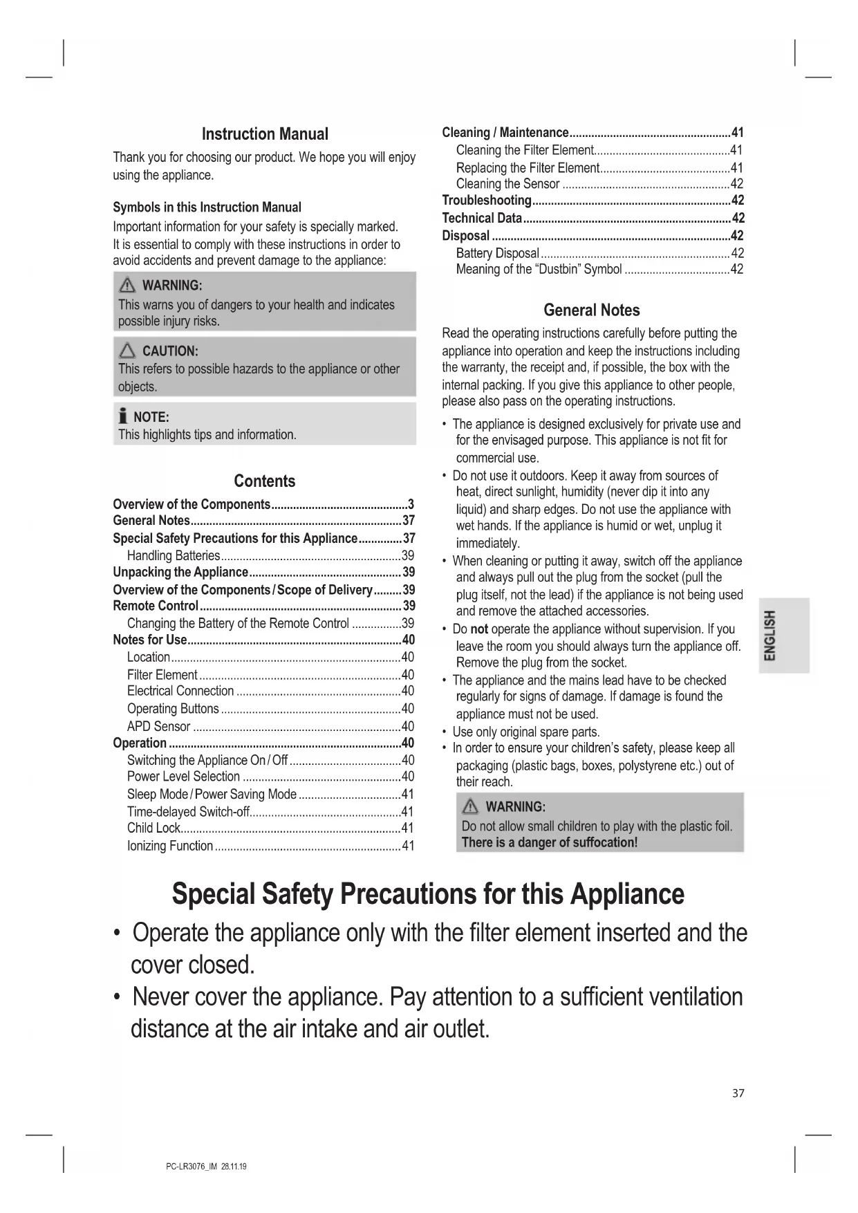 - Never cover the appliance. Pay attention to a sufcient ventilation distance at the air intake and air outlet.PC-LR3076_IM 28.11.19