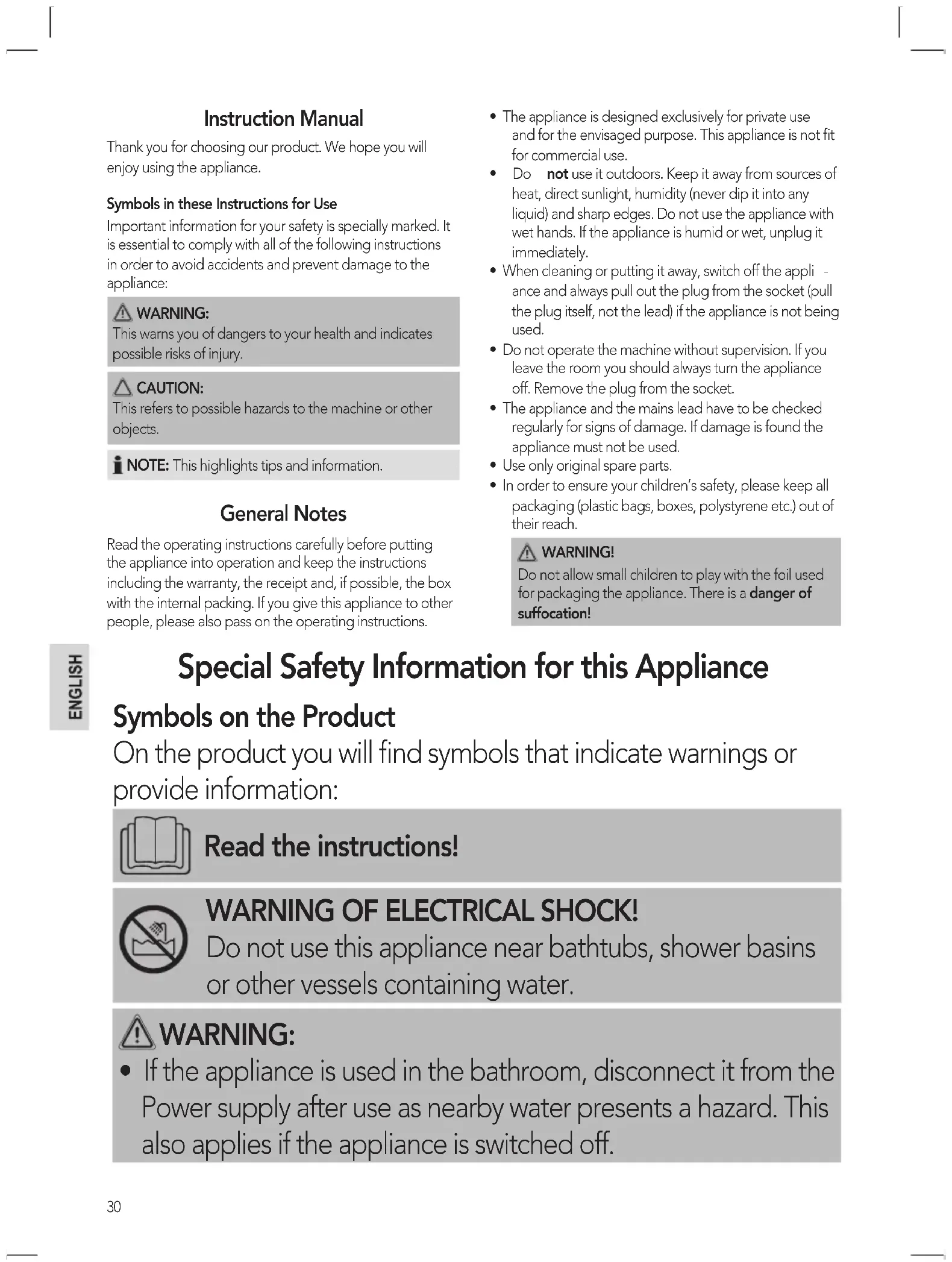 - In order to ensure your children’s safety, please keep all packaging (plastic bags, boxes, polystyrene etc.) out of their reach. WARNING! Do not allow small children to play with the foil used for packaging the appliance. There is a danger of suffocation! Special Safety Information for this Appliance Symbols on the Product On the product you will find symbols that indicate warnings or provide information: Read the instructions! WARNING OF ELECTRICAL SHOCK! Do not use this appliance near bathtubs, shower basins or other vessels containing water.