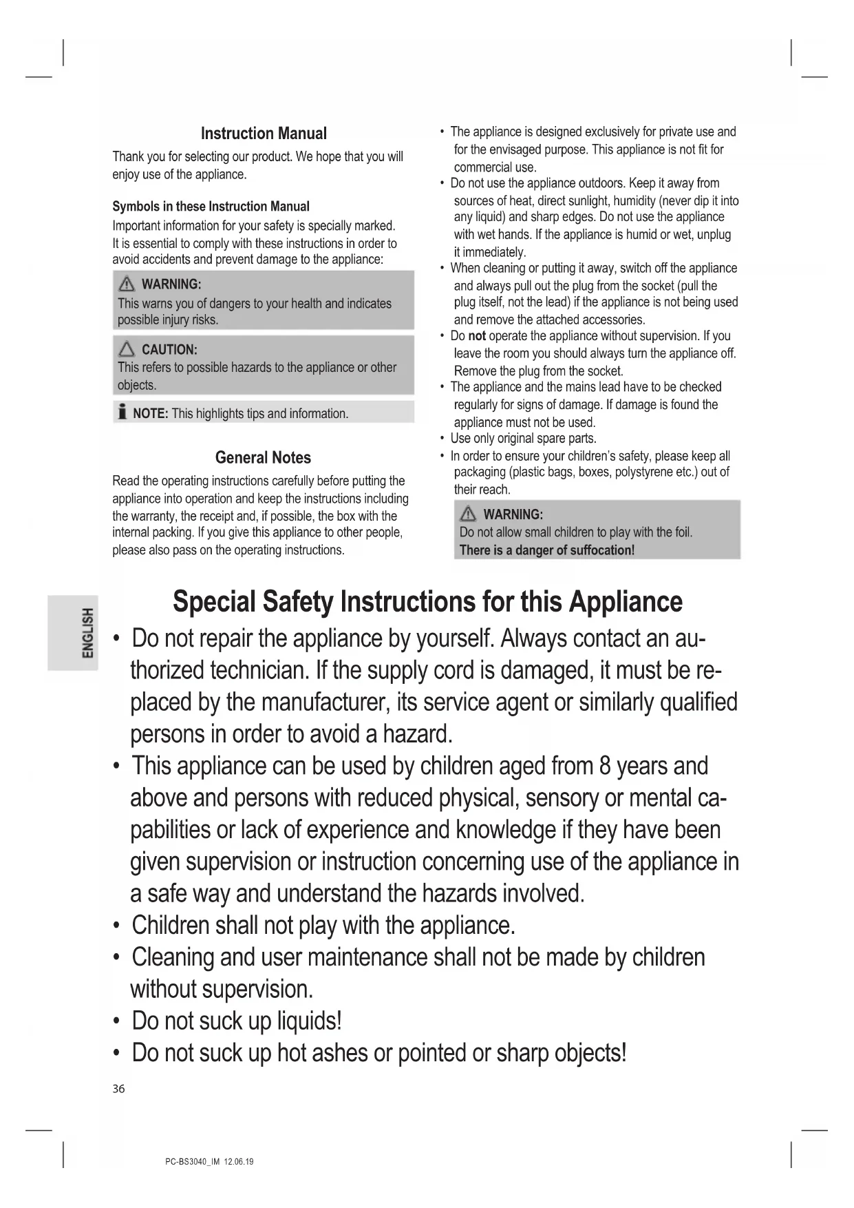 - Ecodesign Requirements for Vacuum Cleaners COM- MISSION REGULATION (EU) No. 666 / 2013 Disposal Meaning of the “Dustbin” Symbol Protect our environment: do not dispose of electrical equipment in the domestic waste. Please return any electrical equipment that you will no longer use to the collection points provided for their disposal. This helps avoid the potential effects of incorrect disposal on the environment and human health. This will contribute to the recycling and other forms of re-utilisation of electrical and electronic equipment. Information concerning where the equipment can be disposed of can be obtained from your local authority.PC-BS3040_IM 12.06.19