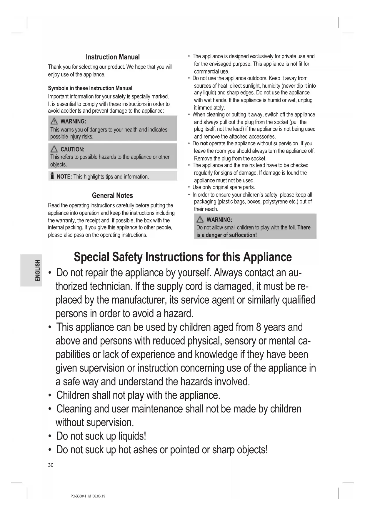Do not allow small children to play with the foil. There is a danger of suffocation! Special Safety Instructions for this Appliance
