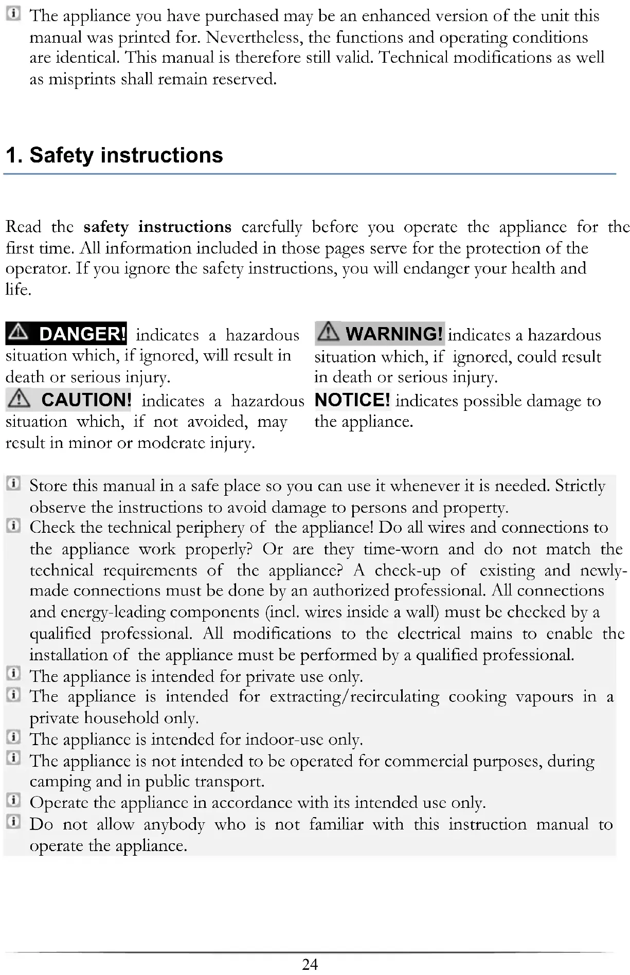 Read the safety instructions carefully before you operate the appliance for the first time. All information included in those pages serve for the protection of the operator. If you ignore the safety instructions, you will endanger your health and life. DANGER! indicates a hazardous situation which, if ignored, will result in death or serious injury. WARNING! indicates a hazardous situation which, if ignored, could result in death or serious injury. CAUTION! indicates a hazardous situation which, if not avoided, may result in minor or moderate injury. NOTICE! indicates possible damage to the appliance. Store this manual in a safe place so you can use it whenever it is needed. Strictly observe the instructions to avoid damage to persons and property. Check the technical periphery of the appliance! Do all wires and connections to the appliance work properly? Or are they time-worn and do not match the technical requirements of the appliance? A check-up of existing and newly- made connections must be done by an authorized professional. All connections and energy-leading components (incl. wires inside a wall) must be checked by a qualified professional. All modifications to the electrical mains to enable the installation of the appliance must be performed by a qualified professional. The appliance is intended for private use only. The appliance is intended for extracting/recirculating cooking vapours in a private household only. The appliance is intended for indoor-use only. The appliance is not intended to be operated for commercial purposes, during camping and in public transport. Operate the appliance in accordance with its intended use only. Do not allow anybody who is not familiar with this instruction manual to operate the appliance.25 DANGER