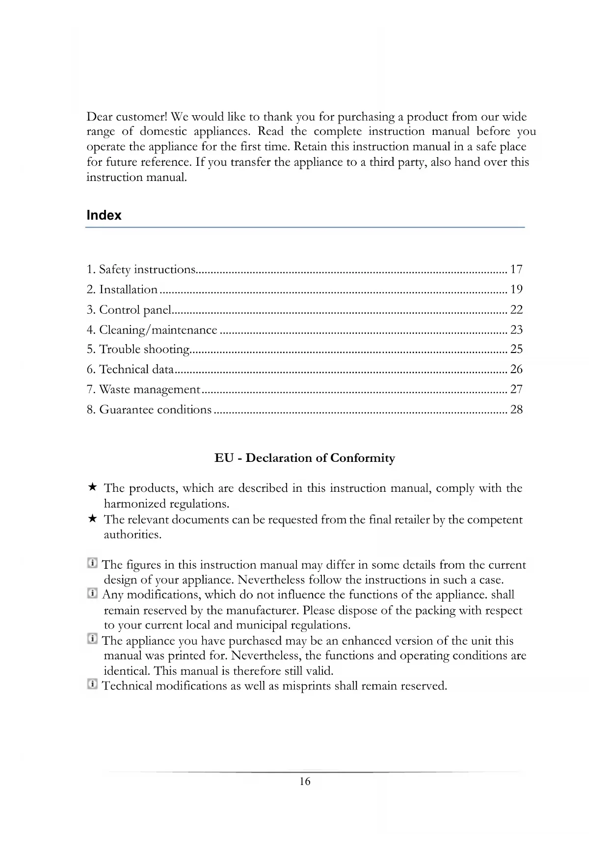 EU - Declaration of Conformity The products, which are described in this instruction manual, comply with the harmonized regulations. The relevant documents can be requested from the final retailer by the competent authorities. The figures in this instruction manual may differ in some details from the current design of your appliance. Nevertheless follow the instructions in such a case. Any modifications, which do not influence the functions of the appliance. shall remain reserved by the manufacturer. Please dispose of the packing with respect to your current local and municipal regulations. The appliance you have purchased may be an enhanced version of the unit this manual was printed for. Nevertheless, the functions and operating conditions are identical. This manual is therefore still valid. Technical modifications as well as misprints shall remain reserved.17