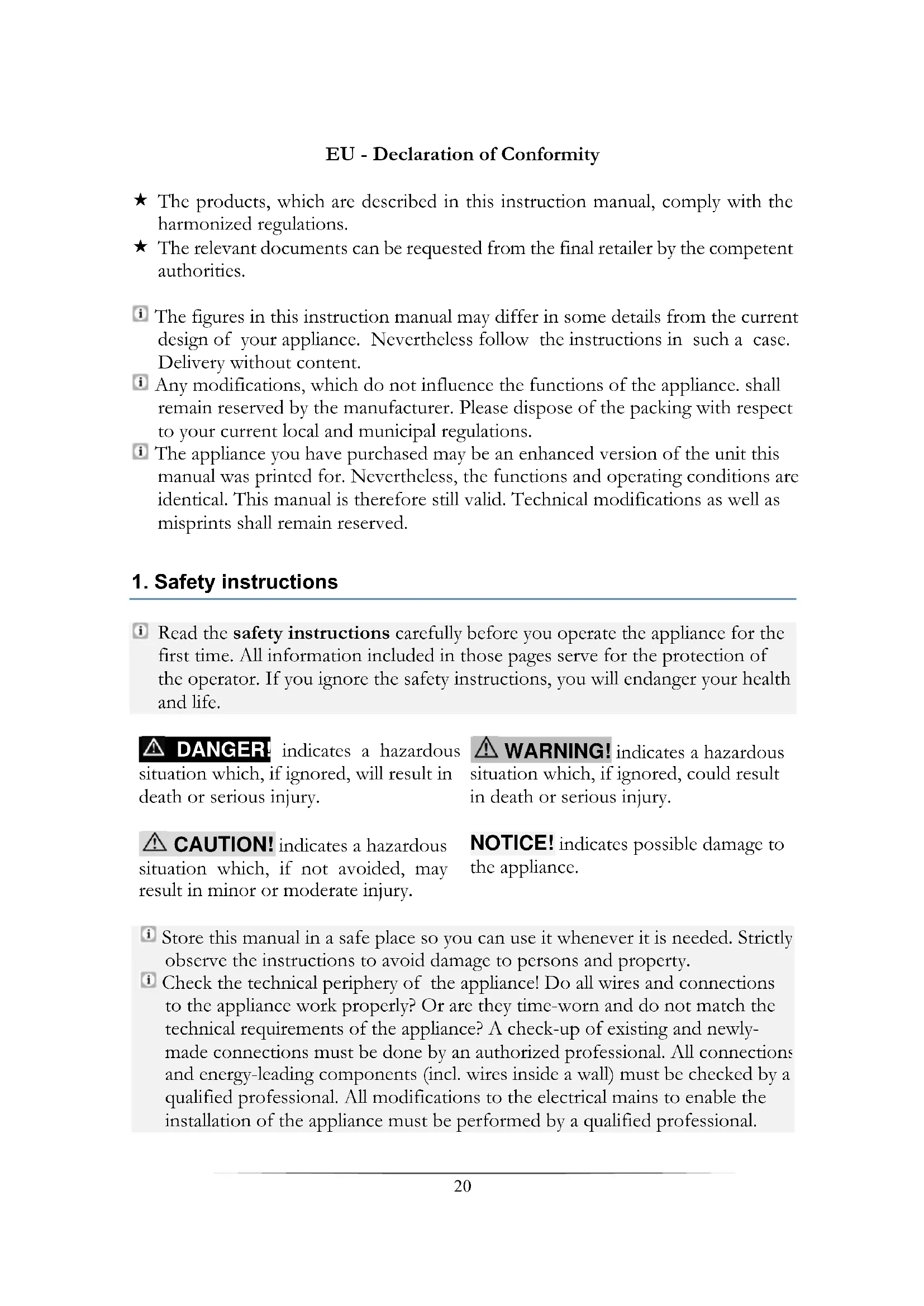 Read the safety instructions carefully before you operate the appliance for the first time. All information included in those pages serve for the protection of the operator. If you ignore the safety instructions, you will endanger your health and life. DANGER! indicates a hazardous situation which, if ignored, will result in death or serious injury. WARNING! indicates a hazardous situation which, if ignored, could result in death or serious injury. CAUTION! indicates a hazardous situation which, if not avoided, may result in minor or moderate injury. NOTICE! indicates possible damage to the appliance.
