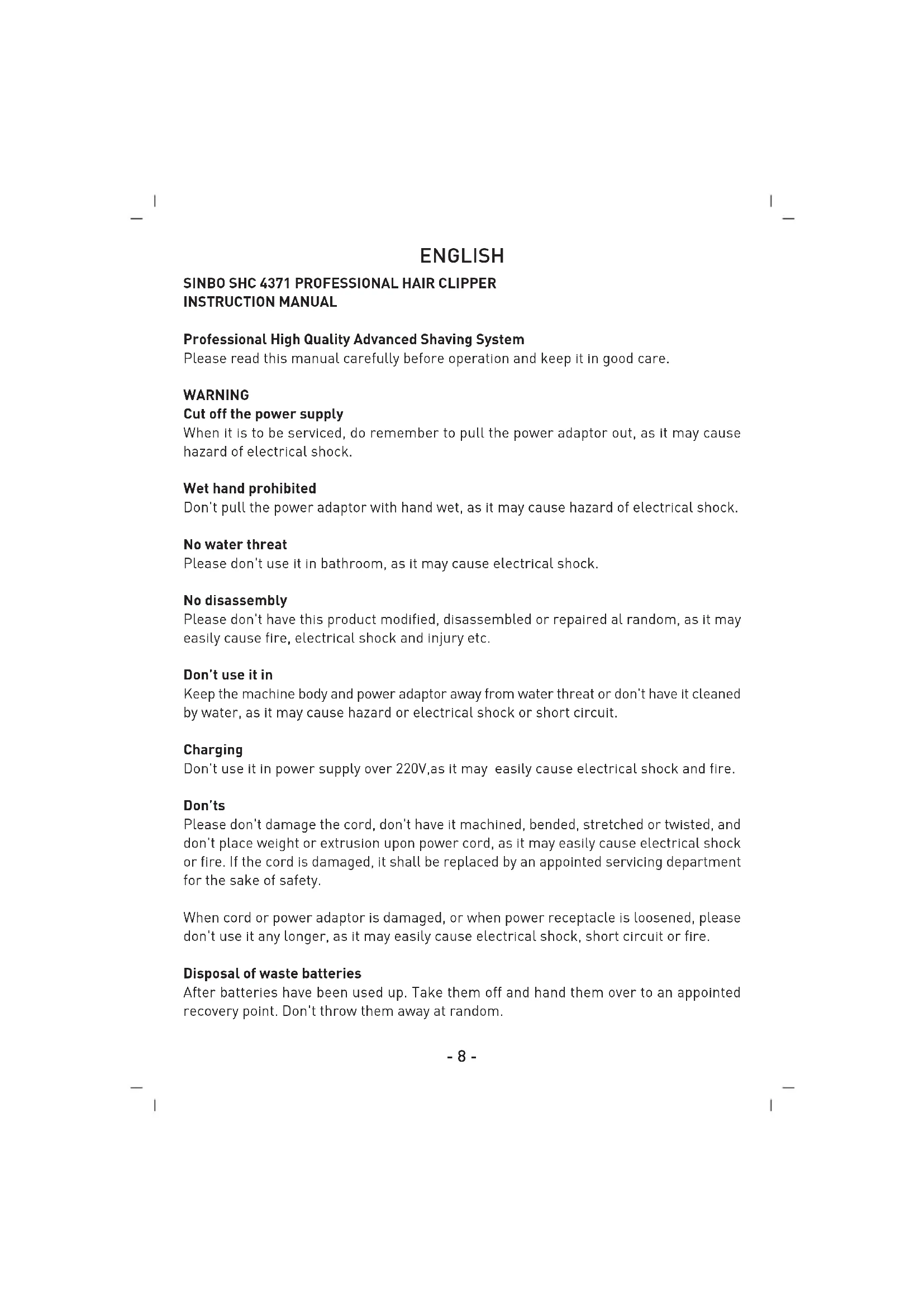 INSTRUCTION MANUAL Professional High Quality Advanced Shaving System Please read this manual carefully before operation and keep it in good care. WARNING Cut off the power supply When it is to be serviced, do remember to pull the power adaptor out, as it may cause hazard of electrical shock. Wet hand prohibited Don't pull the power adaptor with hand wet, as it may cause hazard of electrical shock. No water threat Please don't use it in bathroom, as it may cause electrical shock. No disassembly Please don't have this product modified, disassembled or repaired al random, as it may easily cause fire, electrical shock and injury etc. Don’t use it in Keep the machine body and power adaptor away from water threat or don't have it cleaned by water, as it may cause hazard or electrical shock or short circuit. Charging Don't use it in power supply over 220V,as it may easily cause electrical shock and fire. Don’ts Please don't damage the cord, don't have it machined, bended, stretched or twisted, and don't place weight or extrusion upon power cord, as it may easily cause electrical shock or fire. If the cord is damaged, it shall be replaced by an appointed servicing department for the sake of safety. When cord or power adaptor is damaged, or when power receptacle is loosened, please don't use it any longer, as it may easily cause electrical shock, short circuit or fire. Disposal of waste batteries After batteries have been used up. Take them off and hand them over to an appointed recovery point. Don't throw them away at random.- 9 - SPECIFICATION AC220-240V, 50/60Hz, 3W 8 hour charging DC3V 600mA BEFORE USE Attention remarks - Please charge 12H after first using - Put some oil on the blade, the blade or clipper getting hot when it is working is normal. - Oil position 5 points. - Specially in arrow points, do not using gasoline, alcohol and banana oil clean the body, it will fades clipper color. - Can use suds clean the clipper. - Do not use the clipper in the bathroom. - Do not charge the clipper when room temperature lower than 0°or higher than 40° - Please put the clipper where child can not touch. PARTS NAME