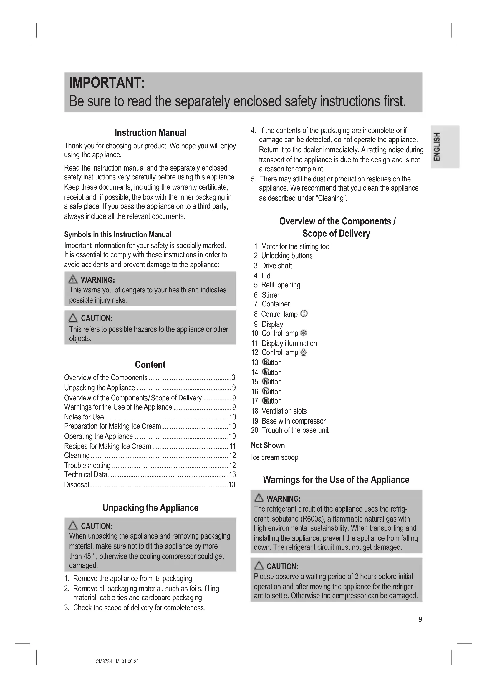 - Clean the base and the recess with a damp cloth. Troubleshooting Problem Possible Cause Solution No function. No power supply. Check the wall outlet with a different appliance; connect the plug properly to the wall outlet. The appliance is in standby mode even though ice prepara- tion has not yet nished. The power supply has been discon- nected. Start the program again for the remaining time. Compressor noisy. Mains power supply too low. Turn the appliance off and check the mains power supply. The stirrer stops during operation. The ice cream is too hard and blocks the motor (Protection mechanism). Switch off the appliance and disconnect the mains plug from the socket. Remove the ice cream. The compressor does not switch on. The overheat protection has been triggered. Let the appliance cool down for approx. 30 min- utes before starting again.ICM3784_IM 01.06.22