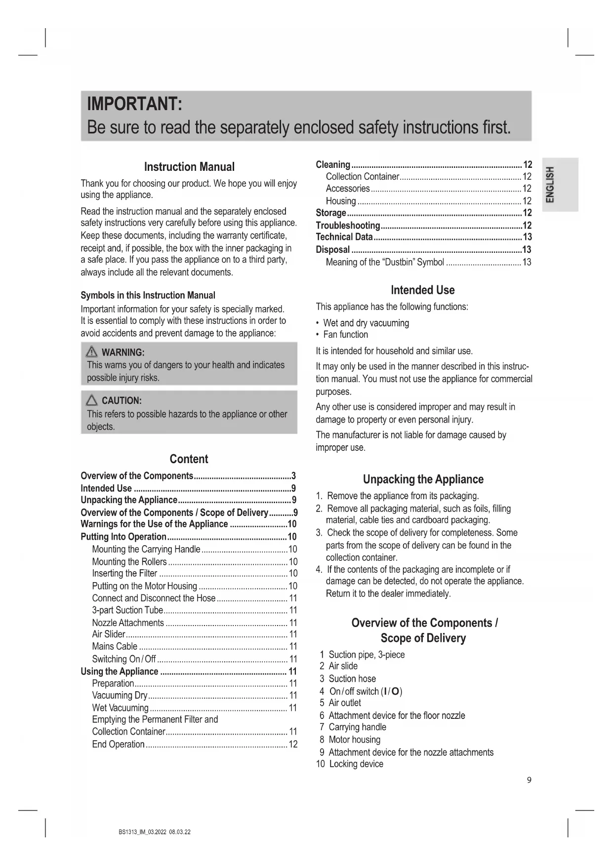 - If the contents of the packaging are incomplete or if damage can be detected, do not operate the appliance. Return it to the dealer immediately.