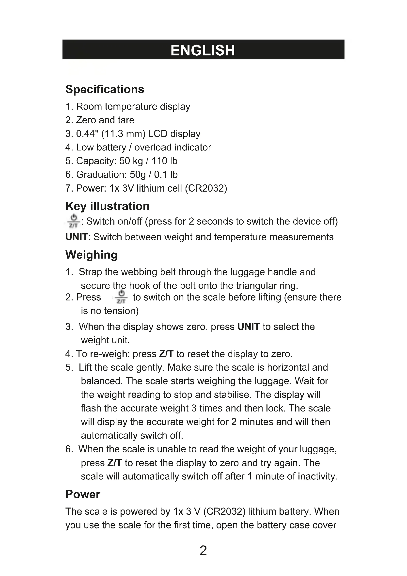 SCLU110GY 2018-08-022 ENGLISH Electronic luggage scale Specifications