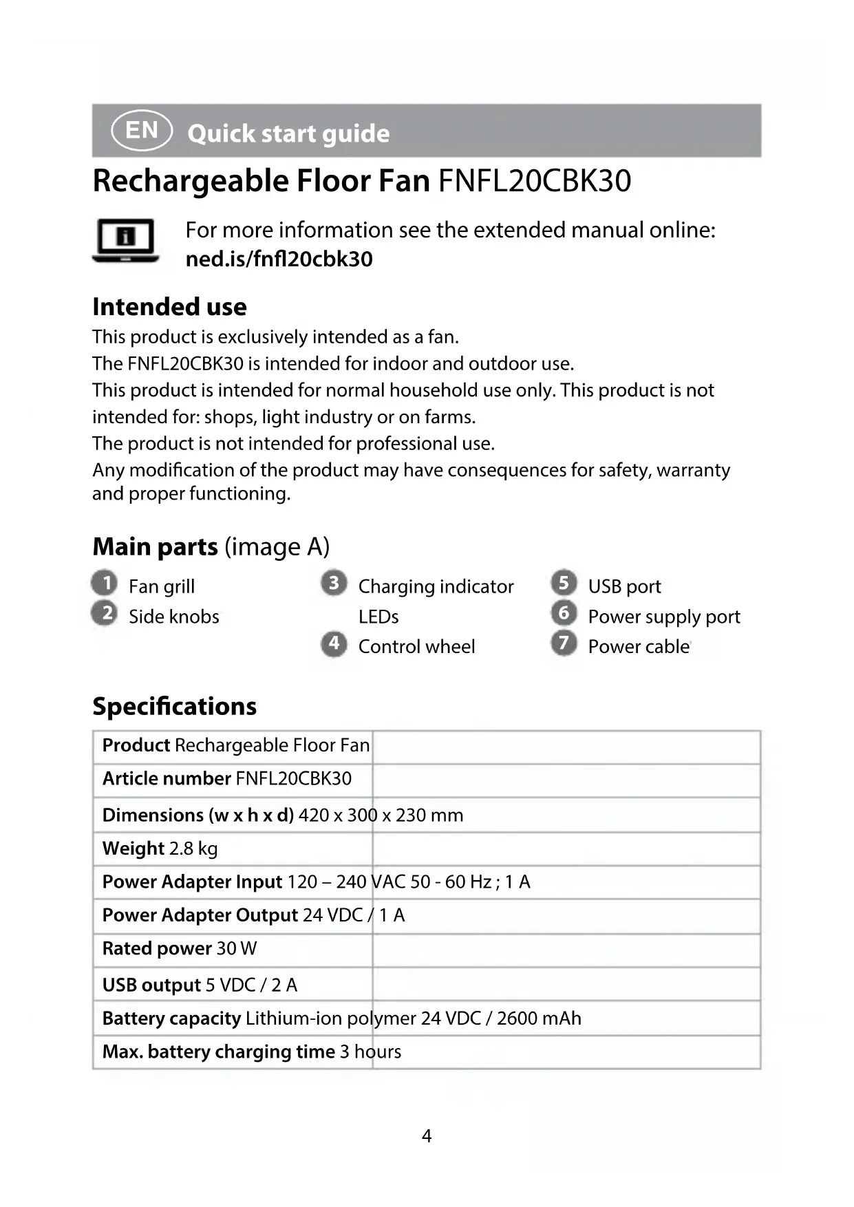 ned.is/fn20cbk30 Rechargeable Floor Fan 30 cm diameter with integrated USB output FNFL20CBK30a Quick start guide 4