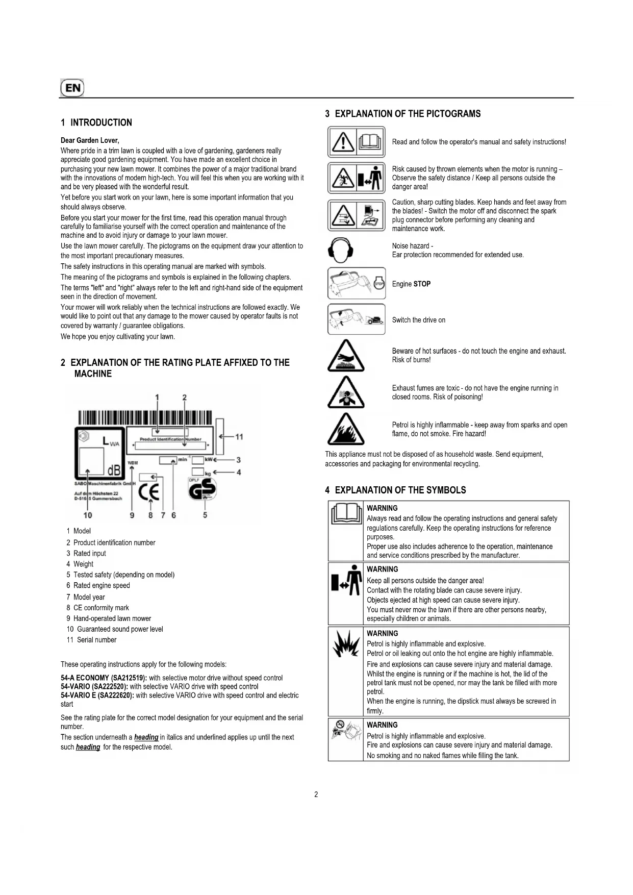 These operating instructions apply for the following models: 54-A ECONOMY (SA212519): with selective motor drive without speed control 54-VARIO (SA222520): with selective VARIO drive with speed control 54-VARIO E (SA222620): with selective VARIO drive with speed control and electric start See the rating plate for the correct model designation for your equipment and the serial number. The section underneath a heading in italics and underlined applies up until the next such heading for the respective model.