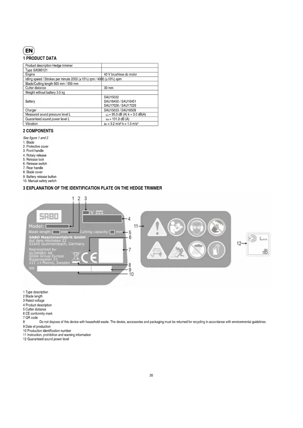 Manufacturer: SABO Maschinenfabrik GmbH Address: Auf dem Höchsten 22, 51645 Gummersbach, Germany Represented by: GLOBGRO AB, Globe Group Europe Riggaregatan 53, 211 13 Malmö, Sweden Name and address of person who is authorised to prepare the technical file: Name: Peter Söderström Address: Riggaregatan 53, 211 13 Malmö, Sweden We herewith declare that the product Category: 40 V hedge trimmer Model: SA560121 Serial number: see product identification plate Year of manufacture: see product identification plate