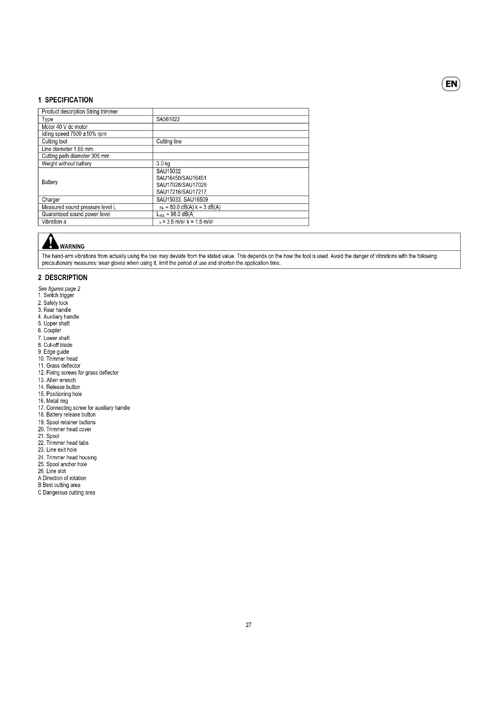 WARNING The hand-arm vibrations from actually using the tool may deviate from the stated value. This depends on the how the tool is used. Avoid the danger of vibrations with the following precautionary measures: wear gloves when using it, limit the period of use and shorten the application time. 2 DESCRIPTION See figures page 2