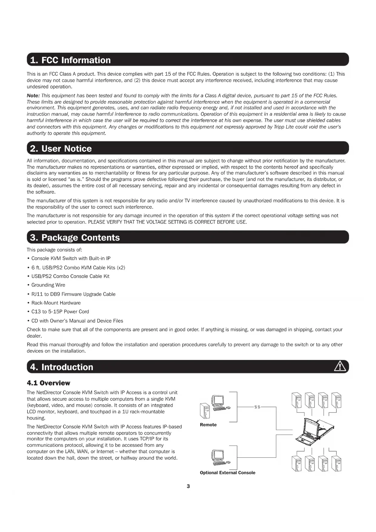 This is an FCC Class A product. This device complies with part 15 of the FCC Rules. Operation is subject to the following two conditions: (1) This device may not cause harmful interference, and (2) this device must accept any interference received, including interference that may cause undesired operation. Note: This equipment has been tested and found to comply with the limits for a Class A digital device, pursuant to part 15 of the FCC Rules. These limits are designed to provide reasonable protection against harmful interference when the equipment is operated in a commercial environment. This equipment generates, uses, and can radiate radio frequency energy and, if not installed and used in accordance with the instruction manual, may cause harmful interference to radio communications. Operation of this equipment in a residential area is likely to cause harmful interference in which case the user will be required to correct the interference at his own expense. The user must use shielded cables and connectors with this equipment. Any changes or modifications to this equipment not expressly approved by Tripp Lite could void the user’s authority to operate this equipment. All information, documentation, and specifications contained in this manual are subject to change without prior notification by the manufacturer. The manufacturer makes no representations or warranties, either expressed or implied, with respect to the contents hereof and specifically disclaims any warranties as to merchantability or fitness for any particular purpose. Any of the manufacturer’s software described in this manual is sold or licensed “as is.” Should the programs prove defective following their purchase, the buyer (and not the manufacturer, its distributor, or its dealer), assumes the entire cost of all necessary servicing, repair and any incidental or consequential damages resulting from any defect in the software. The manufacturer of this system is not responsible for any radio and/or TV interference caused by unauthorized modifications to this device. It is the responsibility of the user to correct such interference. The manufacturer is not responsible for any damage incurred in the operation of this system if the correct operational voltage setting was not selected prior to operation. PLEASE VERIFY THAT THE VOLTAGE SETTING IS CORRECT BEFORE USE. This package consists of: