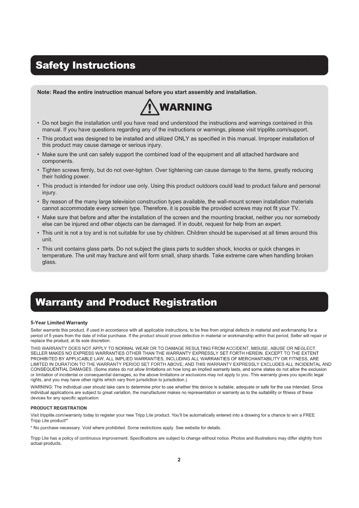 - Do not begin the installation until you have read and understood the instructions and warnings contained in this manual. If you have questions regarding any of the instructions or warnings, please visit tripplite.com/support.