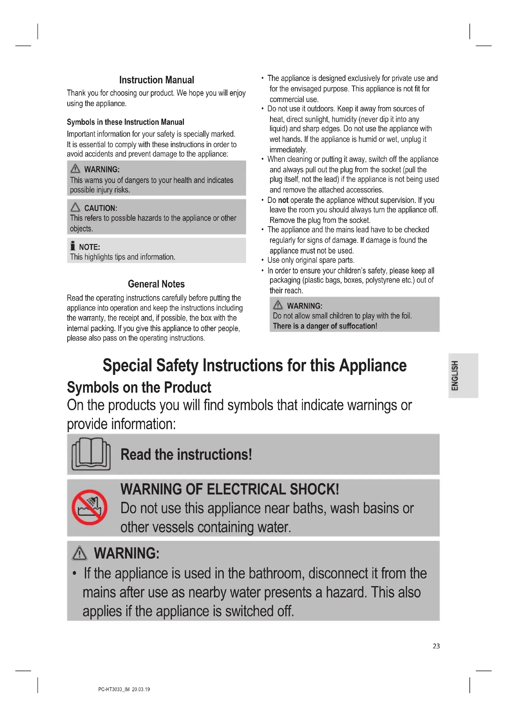 - If the appliance is used in the bathroom, disconnect it from the mains after use as nearby water presents a hazard. This also applies if the appliance is switched off.PC-HT3033_IM 20.03.19