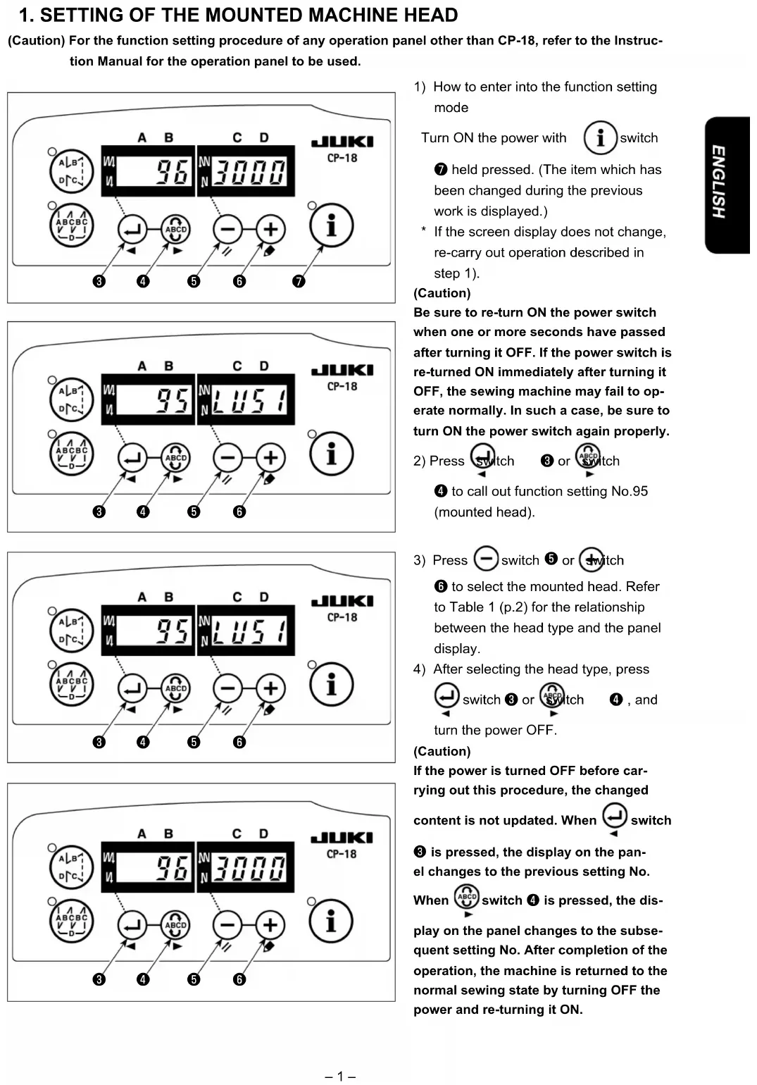 is pressed, the dis- play on the panel changes to the subse- quent setting No. After completion of the operation, the machine is returned to the normal sewing state by turning OFF the power and re-turning it ON.