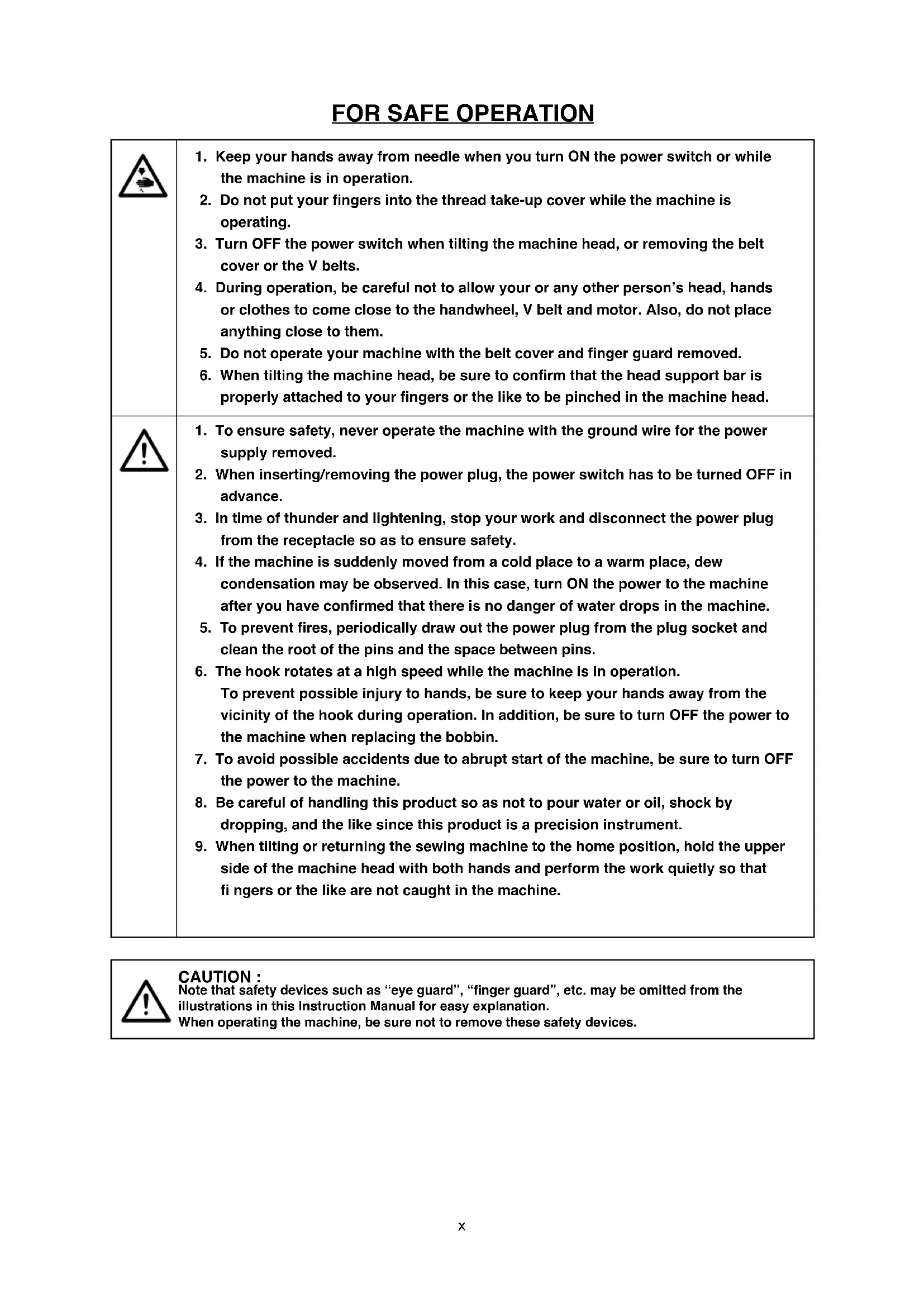side of the machine head with both hands and perform the work quietly so that fi ngers or the like are not caught in the machine. CAUTION : Note that safety devices such as “eye guard”, “fi nger guard”, etc. may be omitted from the illustrations in this Instruction Manual for easy explanation. When operating the machine, be sure not to remove these safety devices.