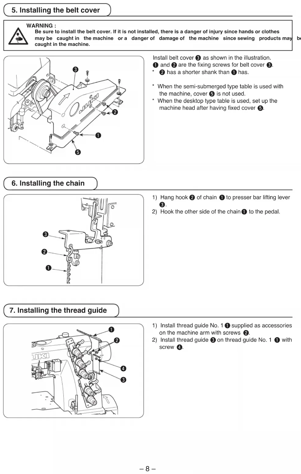 Besuretoinstallthebeltcover.Ifitisnotinstalled,thereisadangerofinjurysincehandsorclothesmaybe caughtin themachine ora dangerof damageof themachine sincesewing productsmay becaughtinthemachine.