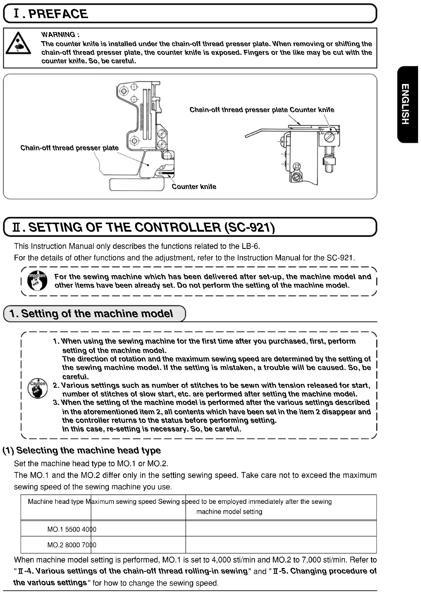. PREFACE Chain-off thread presser plate Counter knifeWARNING :The counter knife is installed under the chain-off thread presser plate. When removing or shifting thechain-off thread presser plate, the counter knife is exposed. Fingers or the like may be cut with thecounter knife. So, be careful.Chain-off thread presser plateCounter knifeWhen machine model setting is performed, MO.1 is set to 4,000 sti/min and MO.2 to 7,000 sti/min. Refer to"@-4. Various settings of the chain-off thread rolling-in sewing" and "@-5. Changing procedure ofthe various settings" for how to change the sewing speed.2 How to change over to the function setting mode