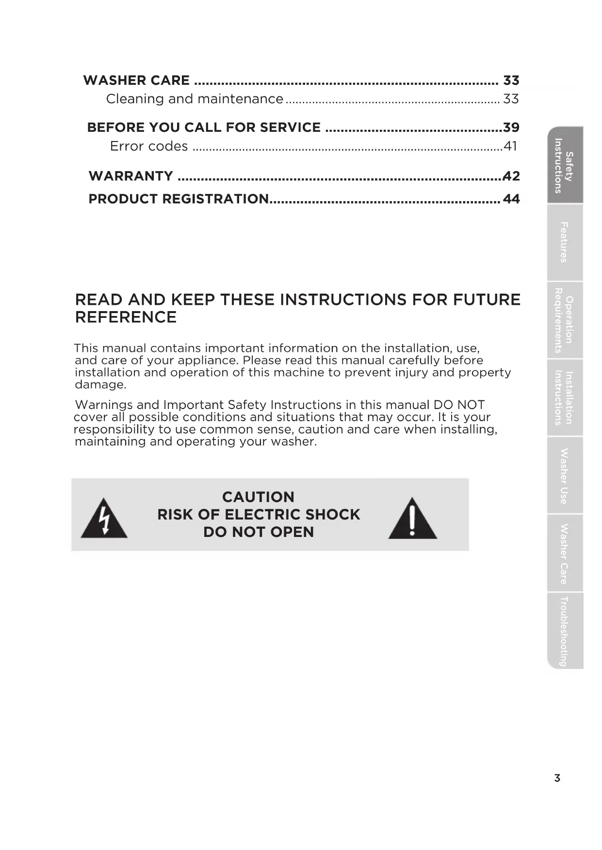 Safety Instructions Features Operation Requirements Installation Instructions Washer Use Washer Care