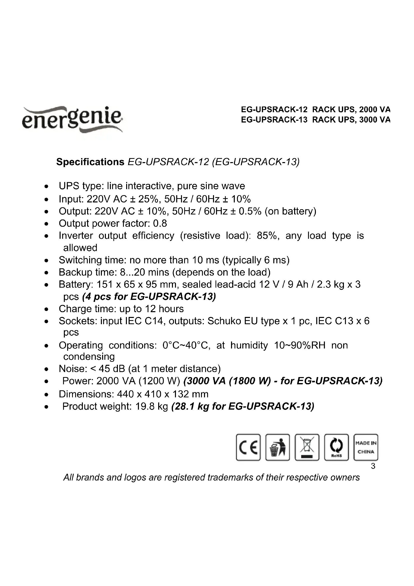 All brands and logos are registered trademarks of their respective owners Specifications EG-UPSRACK-12 (EG-UPSRACK-13) UPS type: line interactive, pure sine wave Input: 220V AC ± 25%, 50Hz / 60Hz ± 10% Output: 220V AC ± 10%, 50Hz / 60Hz ± 0.5% (on battery) Output power factor: 0.8 Inverter output efficiency (resistive load): 85%, any load type is allowed Switching time: no more than 10 ms (typically 6 ms) Backup time: 8...20 mins (depends on the load) Battery: 151 x 65 x 95 mm, sealed lead-acid 12 V / 9 Ah / 2.3 kg x 3 pcs (4 pcs for EG-UPSRACK-13) Charge time: up to 12 hours Sockets: input IEC C14, outputs: Schuko EU type x 1 pc, IEC C13 x 6 pcs Operating conditions: 0°C~40°C, at humidity 10~90%RH non condensing Noise: < 45 dB (at 1 meter distance) Power: 2000 VA (1200 W) (3000 VA (1800 W) - for EG-UPSRACK-13) Dimensions: 440 x 410 x 132 mm Product weight: 19.8 kg (28.1 kg for EG-UPSRACK-13)4