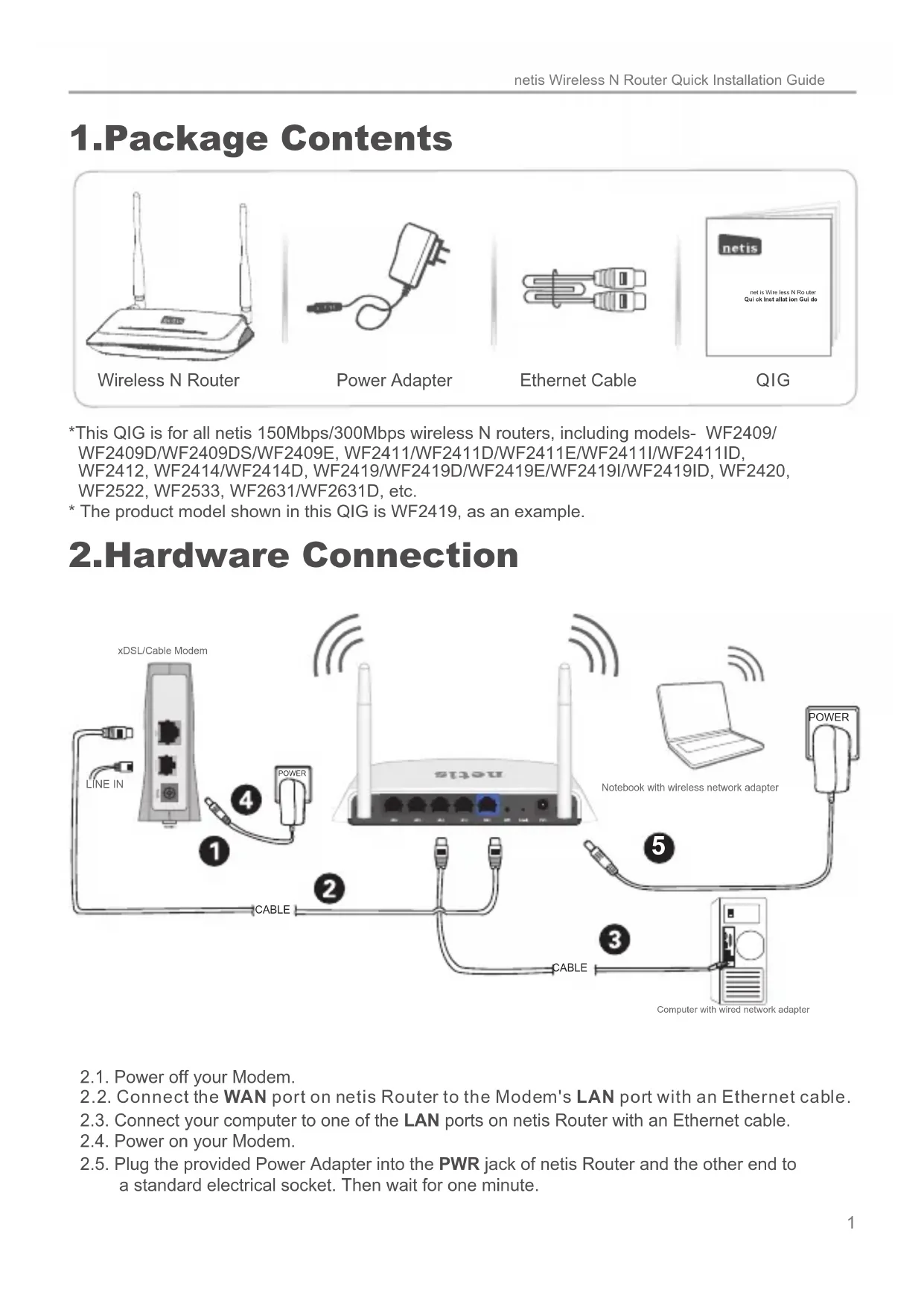 - The product model shown in this QIG is WF2419, as an example. Power Adapter Ethernet Cable Wireless N Router QIG net is Wire less N Ro uterQui ck Inst allat ion Gui de netis Wireless N Router Quick Installation Guide