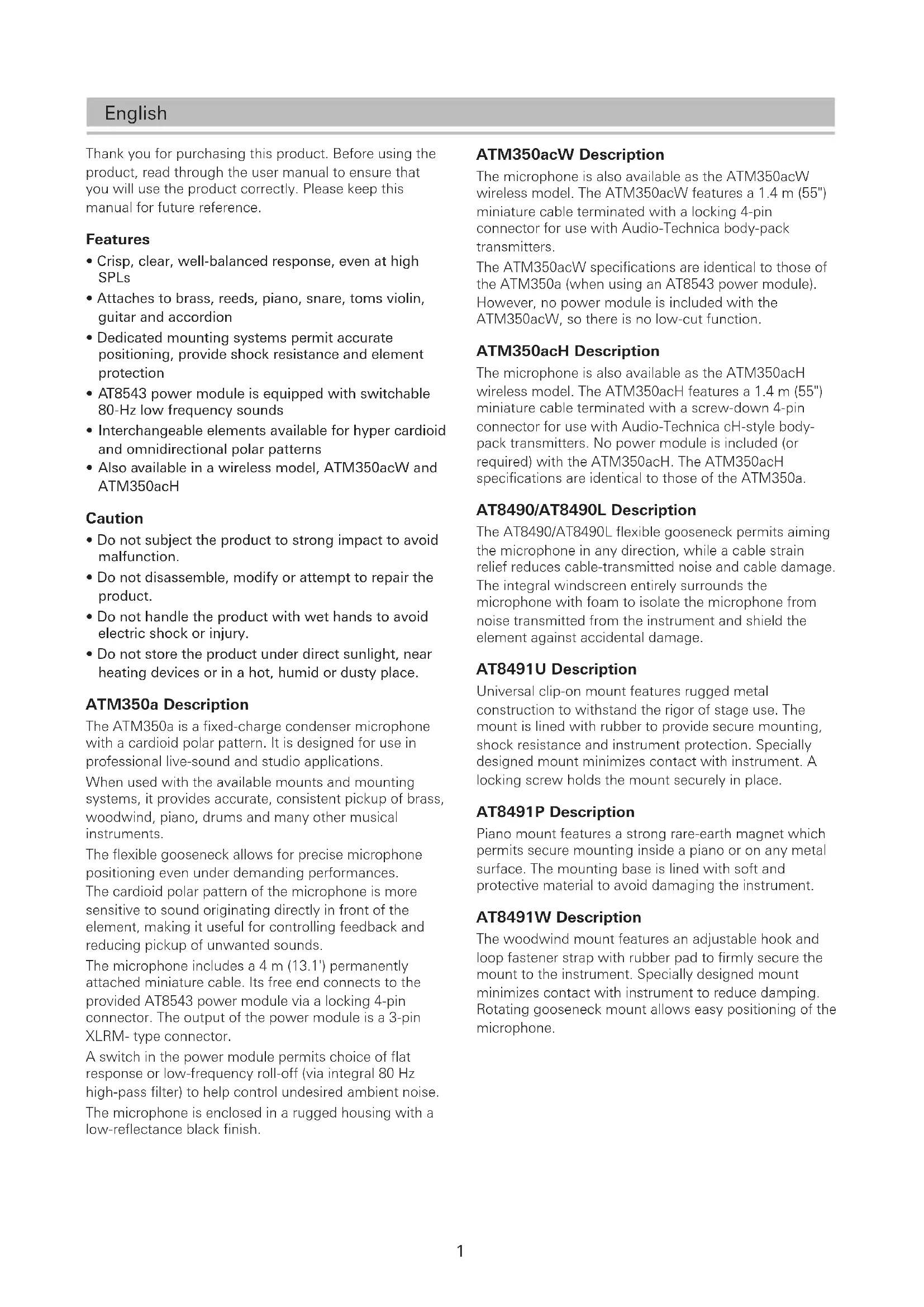 - パワーモジュール AT8543 に接続して測定した特性値です。 周波数(Hz) レスポンス(dB) 0°, 50 cm ローカット1 English ATM350acW Description The microphone is also available as the ATM350acW wireless model. The ATM350acW features a 1.4 m (55") miniature cable terminated with a locking 4-pin connector for use with Audio-Technica body-pack transmitters. The ATM350acW specifications are identical to those of the ATM350a (when using an AT8543 power module). However, no power module is included with the ATM350acW, so there is no low-cut function. ATM350acH Description The microphone is also available as the ATM350acH wireless model. The ATM350acH features a 1.4 m (55") miniature cable terminated with a screw-down 4-pin connector for use with Audio-Technica cH-style body- pack transmitters. No power module is included (or required) with the ATM350acH. The ATM350acH specifications are identical to those of the ATM350a. AT8490/AT8490L Description The AT8490/AT8490L flexible gooseneck permits aiming the microphone in any direction, while a cable strain relief reduces cable-transmitted noise and cable damage. The integral windscreen entirely surrounds the microphone with foam to isolate the microphone from noise transmitted from the instrument and shield the element against accidental damage. AT8491U Description Universal clip-on mount features rugged metal construction to withstand the rigor of stage use. The mount is lined with rubber to provide secure mounting, shock resistance and instrument protection. Specially designed mount minimizes contact with instrument. A locking screw holds the mount securely in place. AT8491P Description Piano mount features a strong rare-earth magnet which permits secure mounting inside a piano or on any metal surface. The mounting base is lined with soft and protective material to avoid damaging the instrument. AT8491W Description The woodwind mount features an adjustable hook and loop fastener strap with rubber pad to firmly secure the mount to the instrument. Specially designed mount minimizes contact with instrument to reduce damping. Rotating gooseneck mount allows easy positioning of the microphone. Thank you for purchasing this product. Before using the product, read through the user manual to ensure that you will use the product correctly. Please keep this manual for future reference. Features