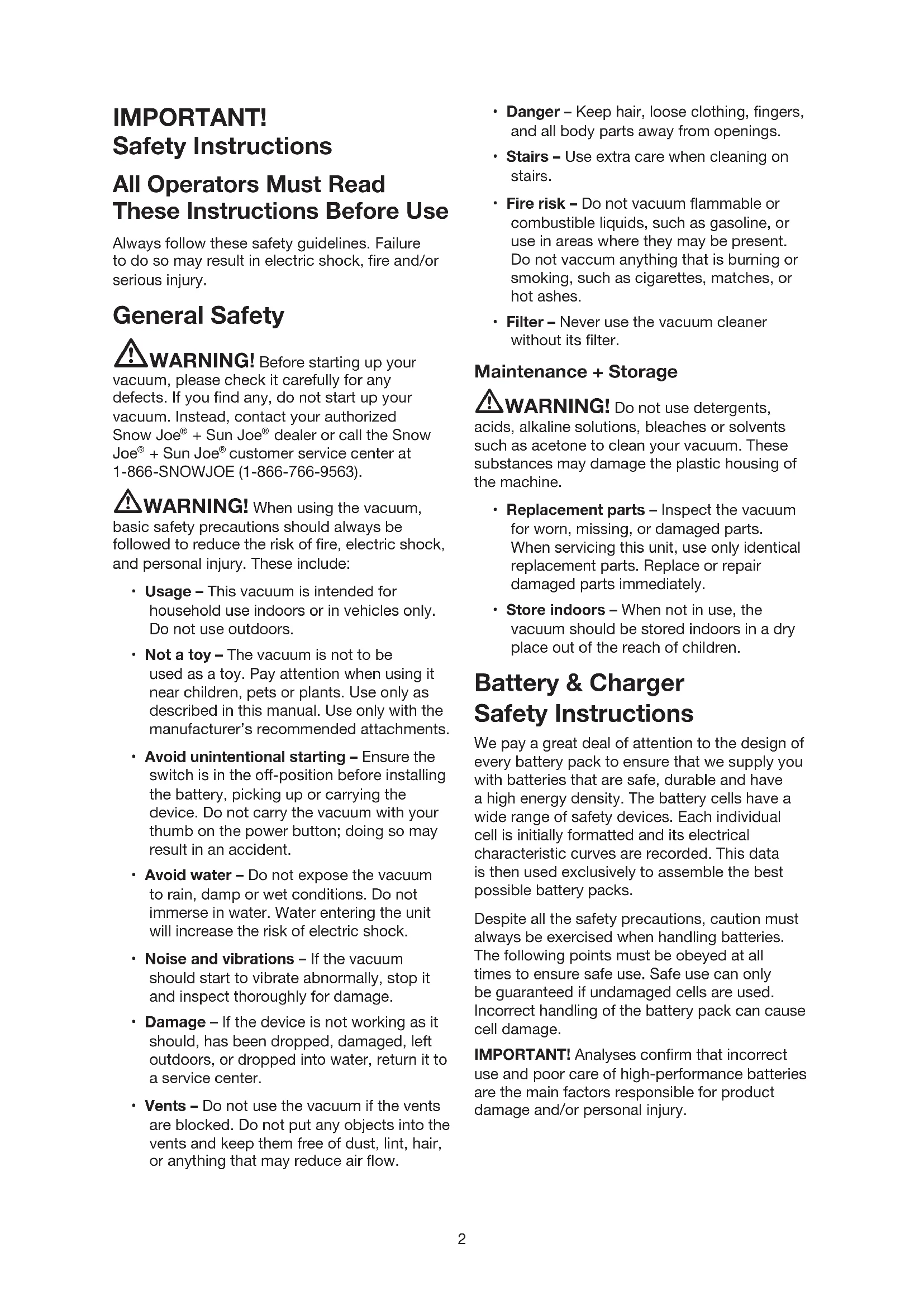 + Sun Joe customer service center at 1-866-SNOWJOE (1-866-766-9563). mWARNING! When using the vacuum, basic safety precautions should always be followed to reduce the risk of re, electric shock, and personal injury. These include:• Usage – This vacuum is intended for household use indoors or in vehicles only. Do not use outdoors.• Not a toy – The vacuum is not to be used as a toy. Pay attention when using it near children, pets or plants. Use only as described in this manual. Use only with the manufacturer’s recommended attachments.• Avoid unintentional starting – Ensure the switch is in the o-position before installing the battery, picking up or carrying the device. Do not carry the vacuum with your thumb on the power button; doing so may result in an accident.• Avoid water – Do not expose the vacuum to rain, damp or wet conditions. Do not immerse in water. Water entering the unit will increase the risk of electric shock.• Noise and vibrations – If the vacuum should start to vibrate abnormally, stop it and inspect thoroughly for damage.• Damage – If the device is not working as it should, has been dropped, damaged, left outdoors, or dropped into water, return it to a service center.• Vents – Do not use the vacuum if the vents are blocked. Do not put any objects into the vents and keep them free of dust, lint, hair, or anything that may reduce air ow.• Danger – Keep hair, loose clothing, ngers, and all body parts away from openings.• Stairs – Use extra care when cleaning on stairs.• Fire risk – Do not vacuum ammable or combustible liquids, such as gasoline, or use in areas where they may be present. Do not vaccum anything that is burning or smoking, such as cigarettes, matches, or hot ashes.• Filter – Never use the vacuum cleaner without its lter.Maintenance + Storage mWARNING! Do not use detergents, acids, alkaline solutions, bleaches or solvents such as acetone to clean your vacuum. These substances may damage the plastic housing of the machine.• Replacement parts – Inspect the vacuum for worn, missing, or damaged parts. When servicing this unit, use only identical replacement parts. Replace or repair damaged parts immediately.• Store indoors – When not in use, the vacuum should be stored indoors in a dry place out of the reach of children. Battery & Charger Safety Instructions We pay a great deal of attention to the design of every battery pack to ensure that we supply you with batteries that are safe, durable and have a high energy density. The battery cells have a wide range of safety devices. Each individual cell is initially formatted and its electrical characteristic curves are recorded. This data is then used exclusively to assemble the best possible battery packs.Despite all the safety precautions, caution must always be exercised when handling batteries. The following points must be obeyed at all times to ensure safe use. Safe use can only be guaranteed if undamaged cells are used. Incorrect handling of the battery pack can cause cell damage.IMPORTANT! Analyses conrm that incorrect use and poor care of high-performance batteries are the main factors responsible for product damage and/or personal injury. 2mCAUTION! To reduce the risk of injury, use only ocial 24V iON+ designated chargers and battery packs. The use of other batteries or chargers poses a risk of re, personal injury and damage. mWARNING! Do not use a battery pack or product that has been damaged or modied. Damaged or modied batteries may exhibit unpredictable behavior resulting in re, explosion or risk of injury. Do not modify or attempt to repair the product or the battery pack except as indicated in the instructions for use and care. Do not wire a battery pack to a power supply or car cigarette lighter, as such misuse will permanently disable or damage the battery pack. Have your battery pack serviced by a qualied repair person using only identical replacement parts. This will ensure that the safety of the battery pack is maintained. mWARNING! To reduce the risk of electric shock, always unplug the charger before performing any cleaning or maintenance. Do not allow water to come into contact with the charger. Do not handle any part of the charger with wet hands. Use a Ground Fault Circuit Interrupter (GFCI) to reduce the risk of electric shock.