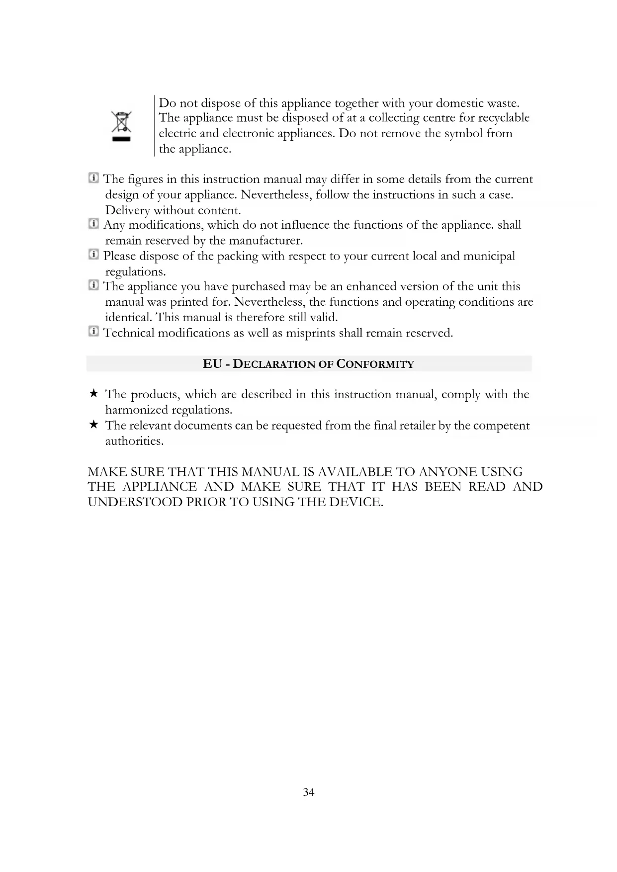 Do not dispose of this appliance together with your domestic waste. The appliance must be disposed of at a collecting centre for recyclable electric and electronic appliances. Do not remove the symbol from the appliance.