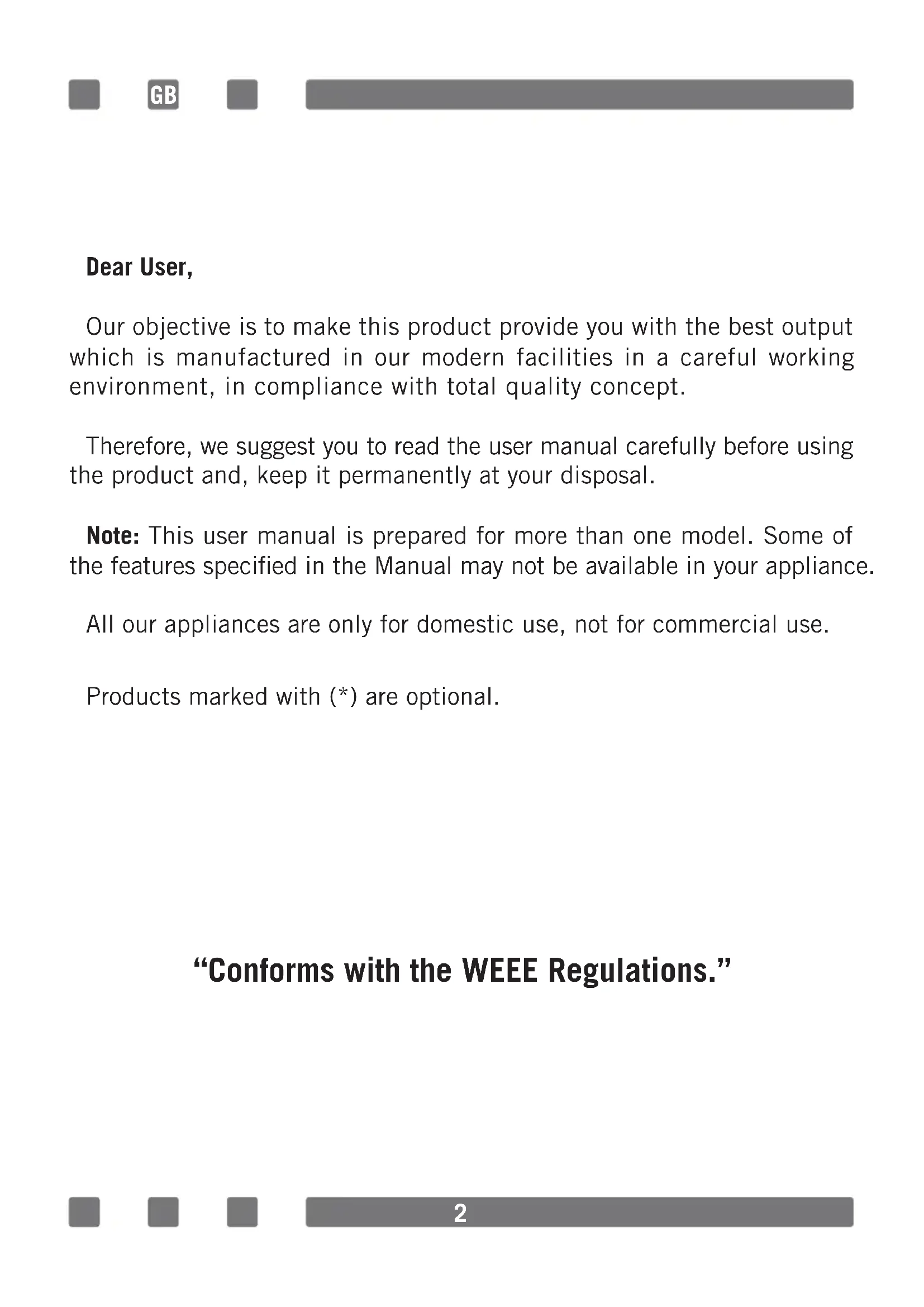circumstances, it may be necessary that buttons are changed. The change should only be done by authorized service. GB29 TROUBLESHOOTING You may solve the problems you may encounter with your product by checking the following points before calling the technical service. Check Points In case you experience a problem about the cooker, rst check the table below and try out the suggestions. Problem Possible cause Remedy No Ignition. No sparks. Check power supply. Cooker cover is not tted properly. Fit the cover properly. Gas supply is closed. Fully open gas supply. Not Proper Ignition. Gas supply not fully open. Fully open gas supply. Cooker cover is not tted properly. Fit the cover properly. Ignition plug is clogged with foreign materials. Wipe off foreign materials with a cloth. Hobs are wet. Carefully dry the hobs. Flame spreader holes are clogged. Clean the ame spreader. Noise coming when burning or during ignition. Cooker cover is not tted properly. Fit the cover properly. Flame turns off during operation. Flame observer device is clogged by foreign material. Clean ame observer device. Overow food turns off the ame. Switch off the hob. Wait for one minute and ignite again. A strong air ow turns off the ame. Please check related hob and check the cooking area for air flows, for example, from an open window. Wait for one minute and ignite again. Yellow ame. Flame spreader holes are clogged. Clean the ame spreader. Different gas is being used. Check the gas being used. Unstable ame. Cooker cover is not tted properly. Fit the cover properly. Gas odour. Hob spout left open. Check if any hob spouts are left open. Leakage from connection of gas cylinder to cooker. Make sure connections are leak-proof. Lighter not operating. Tips or body of ignition plugs are clogged. Clean tips or body of ignition plugs of gas burners. Gas burner pipes are clogged. Clean gas burner pipes.30 HANDLING RULES