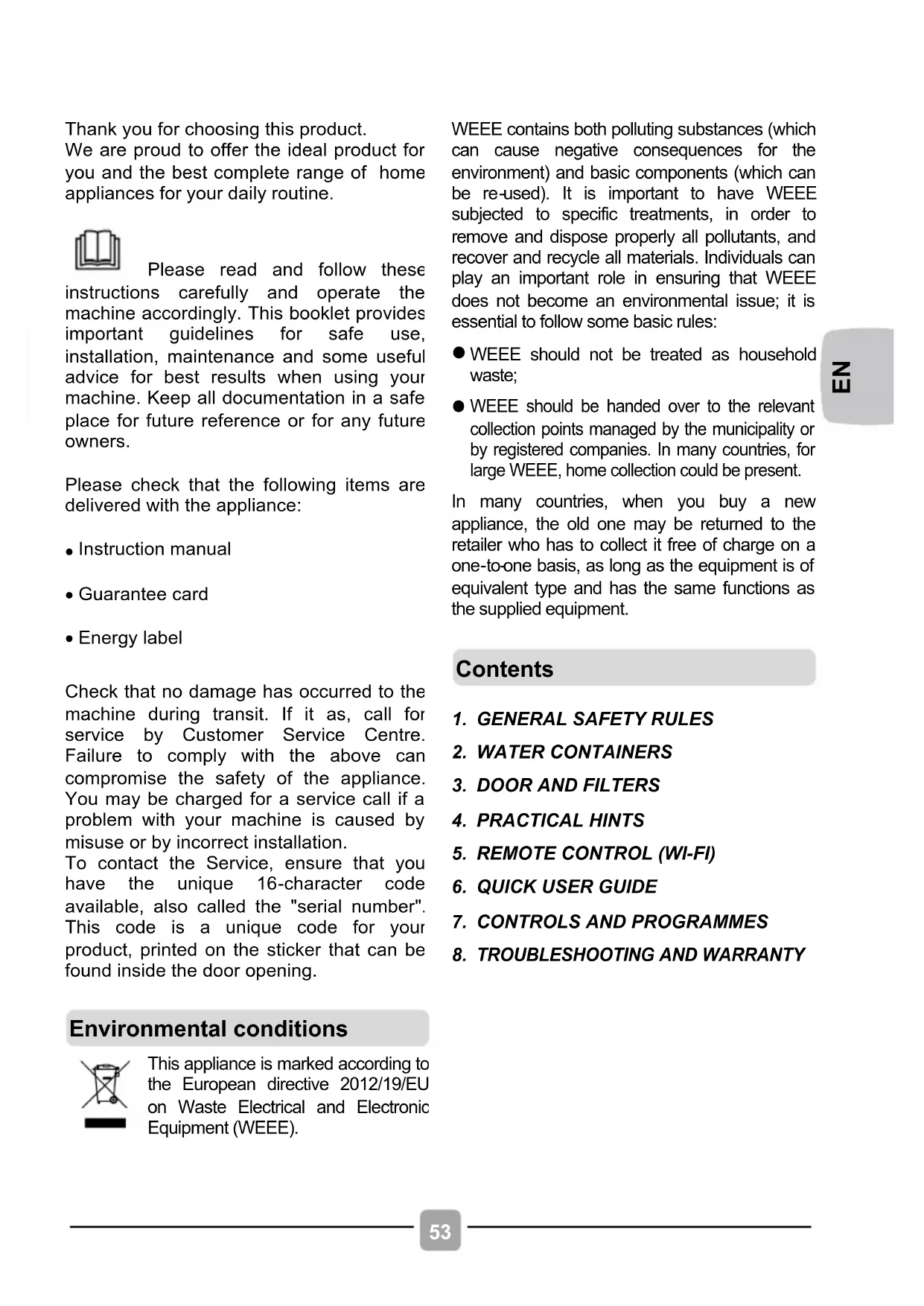 Please read and follow these instructions carefully and operate the machine accordingly. This booklet provides important guidelines for safe use, installation, maintenance and some useful advice for best results when using your machine. Keep all documentation in a safe place for future reference or for any future owners.