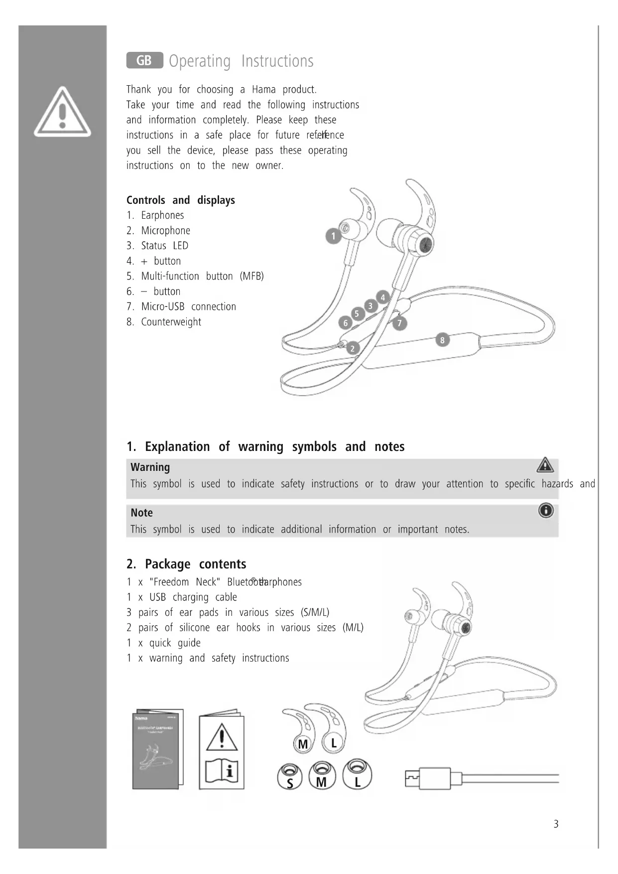 earphones 1 x USB charging cable 3 pairs of ear pads in various sizes (S/M/L) 2 pairs of silicone ear hooks in various sizes (M/L) 1 x quick guide 1 x warning and safety instructions