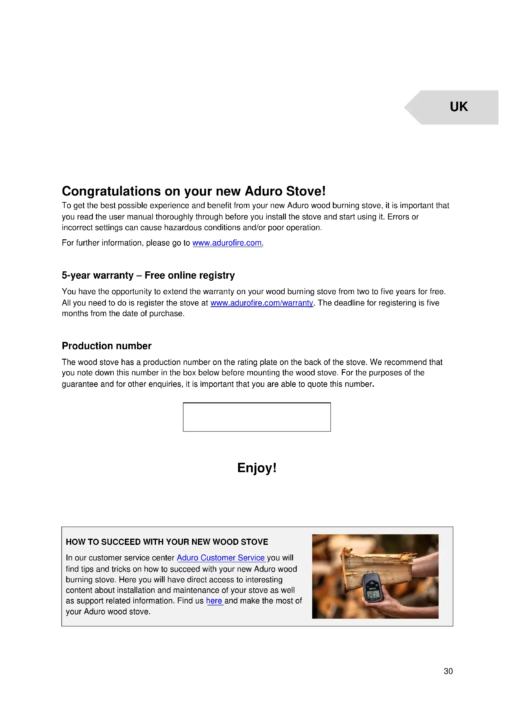 You have the opportunity to extend the warranty on your wood burning stove from two to five years for free. All you need to do is register the stove at www.adurofire.com/warranty. The deadline for registering is five months from the date of purchase.