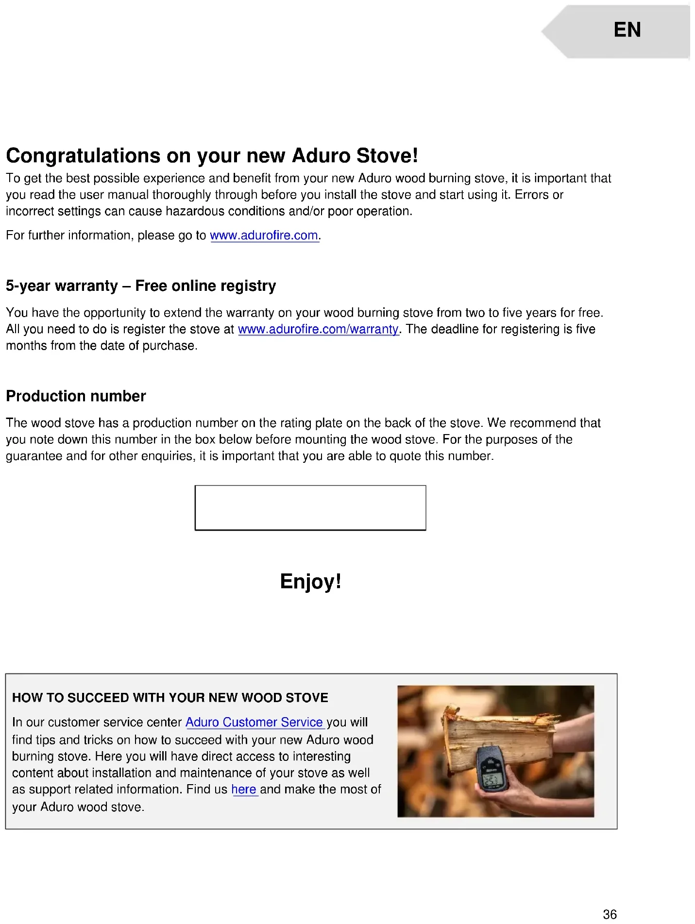 Congratulations on your new Aduro Stove! To get the best possible experience and benefit from your new Aduro wood burning stove, it is important that you read the user manual thoroughly through before you install the stove and start using it. Errors or incorrect settings can cause hazardous conditions and/or poor operation. For further information, please go to www.adurofire.com. 5-year warranty – Free online registry You have the opportunity to extend the warranty on your wood burning stove from two to five years for free. All you need to do is register the stove at www.adurofire.com/warranty. The deadline for registering is five months from the date of purchase. Production number The wood stove has a production number on the rating plate on the back of the stove. We recommend that you note down this number in the box below before mounting the wood stove. For the purposes of the guarantee and for other enquiries, it is important that you are able to quote this number.
