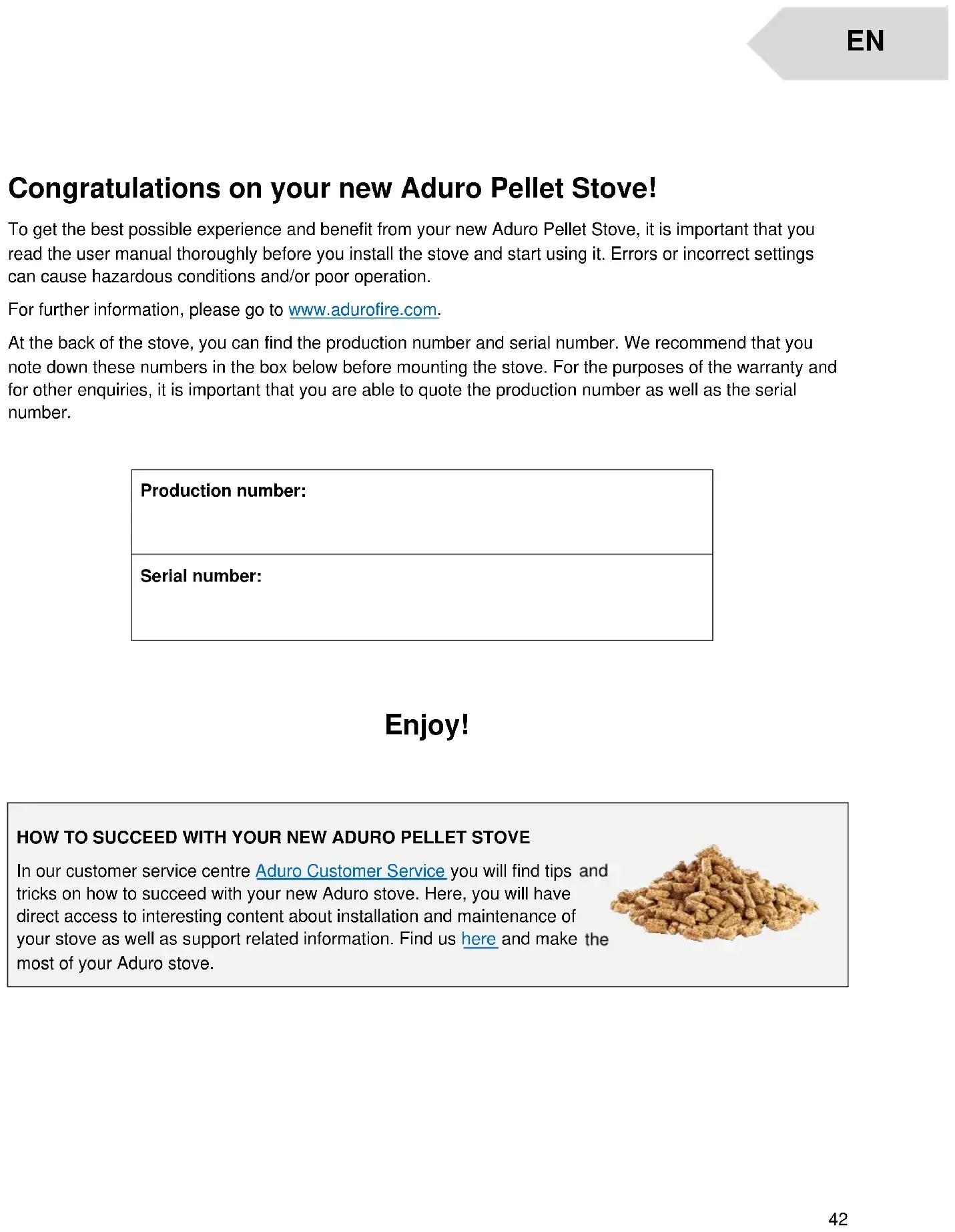 Congratulations on your new Aduro Pellet Stove! To get the best possible experience and benefit from your new Aduro Pellet Stove, it is important that you read the user manual thoroughly before you install the stove and start using it. Errors or incorrect settings can cause hazardous conditions and/or poor operation. For further information, please go to www.adurofire.com. At the back of the stove, you can find the production number and serial number. We recommend that you note down these numbers in the box below before mounting the stove. For the purposes of the warranty and for other enquiries, it is important that you are able to quote the production number as well as the serial number. Production number: Serial number: