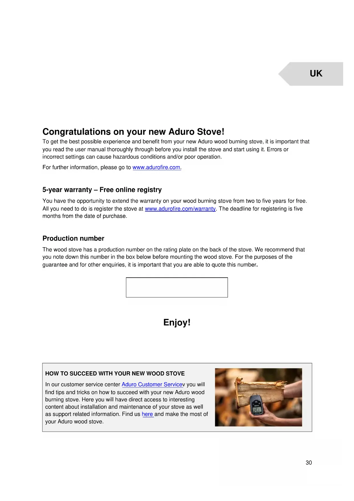 Congratulations on your new Aduro Stove! To get the best possible experience and benefit from your new Aduro wood burning stove, it is important that you read the user manual thoroughly through before you install the stove and start using it. Errors or incorrect settings can cause hazardous conditions and/or poor operation. For further information, please go to www.adurofire.com. 5-year warranty – Free online registry You have the opportunity to extend the warranty on your wood burning stove from two to five years for free. All you need to do is register the stove at www.adurofire.com/warranty. The deadline for registering is five months from the date of purchase. Production number The wood stove has a production number on the rating plate on the back of the stove. We recommend that you note down this number in the box below before mounting the wood stove. For the purposes of the guarantee and for other enquiries, it is important that you are able to quote this number.