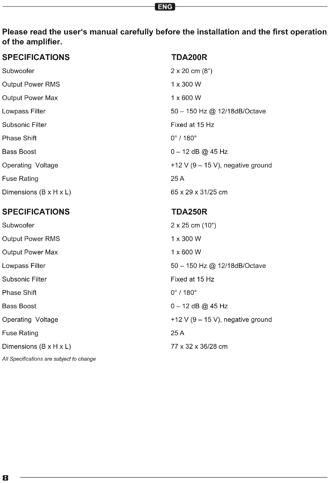 Download the instructions for your Car speaker in PDF format for free! Find your manual Titan TDA250R - Hifonics and take your electronic device back in hand. On this page are published all the documents necessary for the use of your device. Titan TDA250R by Hifonics.