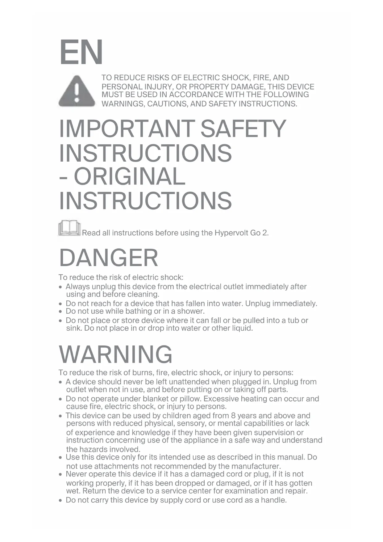 - Pregnancy, diabetes with complications such as neuropathy or retinal damage, wear of pacemakers, recent surgery or injury, epilepsy or migraines, herniated disks, spondylolisthesis, spondylolysis, or spondylosis, recent joint replacements or IUD, metal pins or plates or any concerns about your physical health. Frail individuals and children should be accompanied by an adult when using any percussion or vibration device. These contraindications do not mean that you are not able to use a percussion or vibration device but we advise that before doing so you consult your physician. Ongoing research is being done on the effects of percussion massage for specific medical disorders that may result in the shortening of the list of contraindications as shown above. The Hypervolt Go 2 contains a battery which must be complied with safely at an appropriate e-waste disposal or recycling facility.CAUTION The battery used in this device may present a risk of fire or chemical burn if mistreated. Do not disassemble, heat above 100º C or incinerate. Dispose of used battery promptly. Keep away from children. Do not disassemble and do not dispose of in fire. SAVE THESE INSTRUCTIONS The Hypervolt Go 2 is a handheld percussion massage device that delivers targeted pulses of pressure to care for muscles, relieve tension, provide a relaxing massage, accelerate warmup and recovery, and help maintain flexibility and range of motion. Operating Press down the power/speed button on the back of the device. Hold for two seconds until the battery level indicator (LED band) illuminates, then release. Your Hypervolt Go 2 is now ready for use. Choose your desired speed (1-3) by pressing the power/speed button once per speed. The white lights on the back will indicate speed setting. To power off, simply hold the power/speed button down for two seconds. Changing head attachments Only change attachments after speed setting is turned to off and head attachment stopped moving. To change head attachments, pull the existing head attachment straight out to remove and insert the desired head directly into the opening while pushing firmly. For the Fork head attachment align the tab on the fork with the groove on the opening and push firmly. Charging Fully charge battery for up to four hours before first use. To charge, connect the DC end of the supplied 18V charger to the charging port on the bottom of the handle and plug the charger into a wall outlet. The LED light band will pulsate to show battery level and indicate active charging. The LED light band colors correspond to the charge level ranging from red (low) to green (fully charged). Full charge is indicated when the LED band remains green and fully illuminated. Battery may be recharged at any time and at any battery level. It is not recommended to fully deplete the battery to the red LED level. The average runtime is 2+ hours depending on speed level and pressure applied during use. It is recommended to turn the device OFF while the it is not in use or during storage and travel. Cleaning and storage Make sure the power is OFF and the battery charger is not attached. Use a damp, clean cloth and gently wipe your Hypervolt Go 2. Store in a clean, cool place, out of direct sunlight, when not in use.SPECIFICATIONS