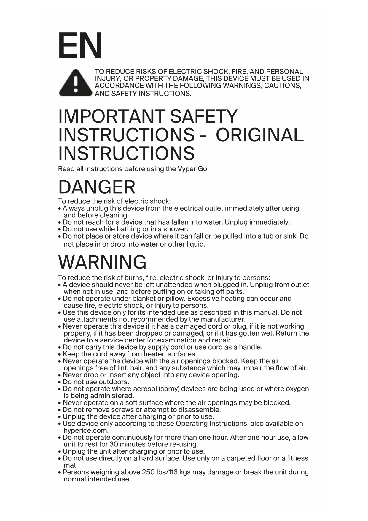 INSTRUCTIONS Read all instructions before using the Vyper Go. DANGER To reduce the risk of electric shock: