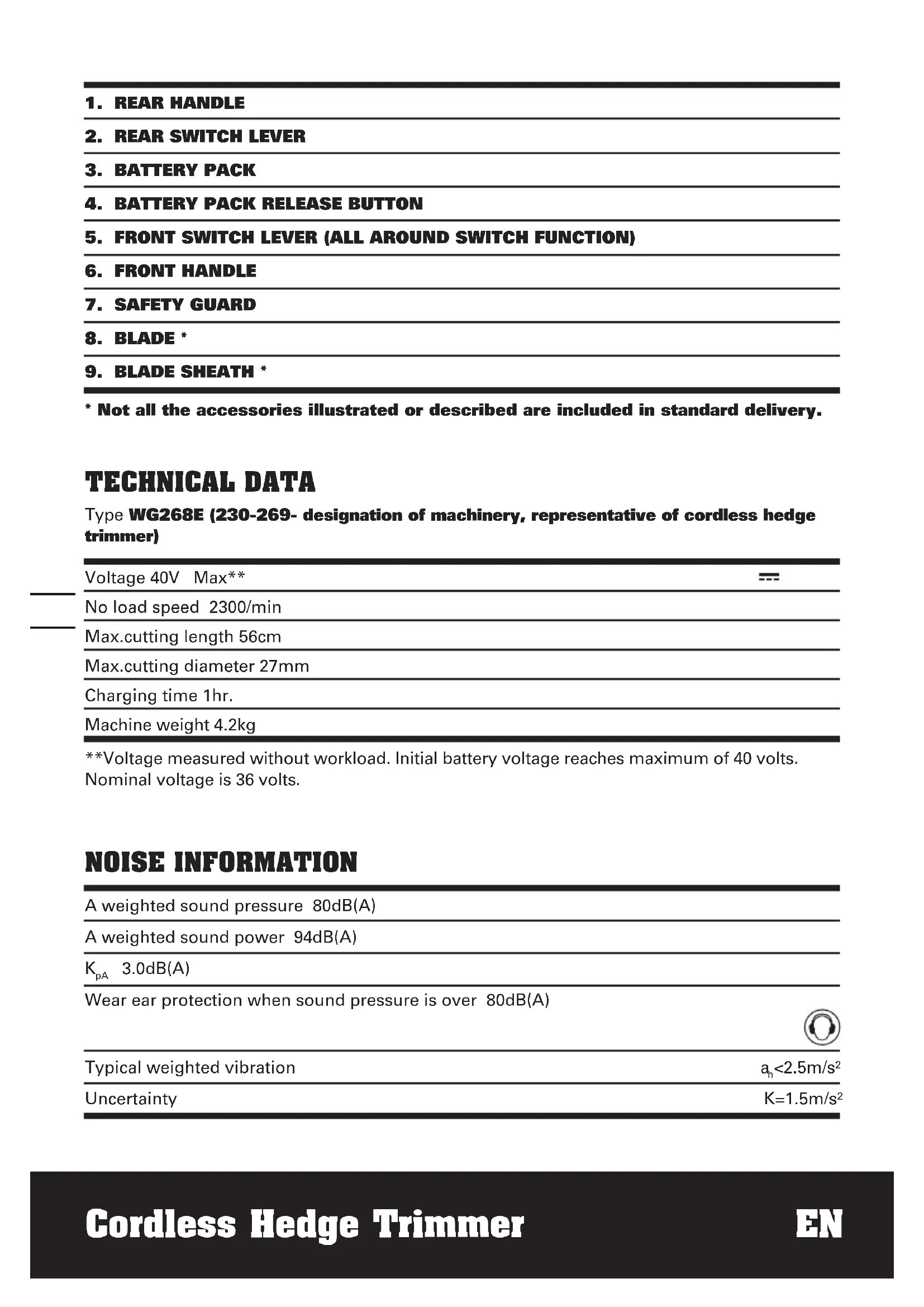 - Not all the accessories illustrated or described are included in standard delivery. TECHNICAL DATA Type WG268E (230-269- designation of machinery, representative of cordless hedge trimmer) Voltage 40V Max** No load speed 2300/min Max.cutting length 56cm Max.cutting diameter 27mm Charging time 1hr. Machine weight 4.2kg **Voltage measured without workload. Initial battery voltage reaches maximum of 40 volts. Nominal voltage is 36 volts. NOISE INFORMATION A weighted sound pressure 80dB(A) A weighted sound power 94dB(A)