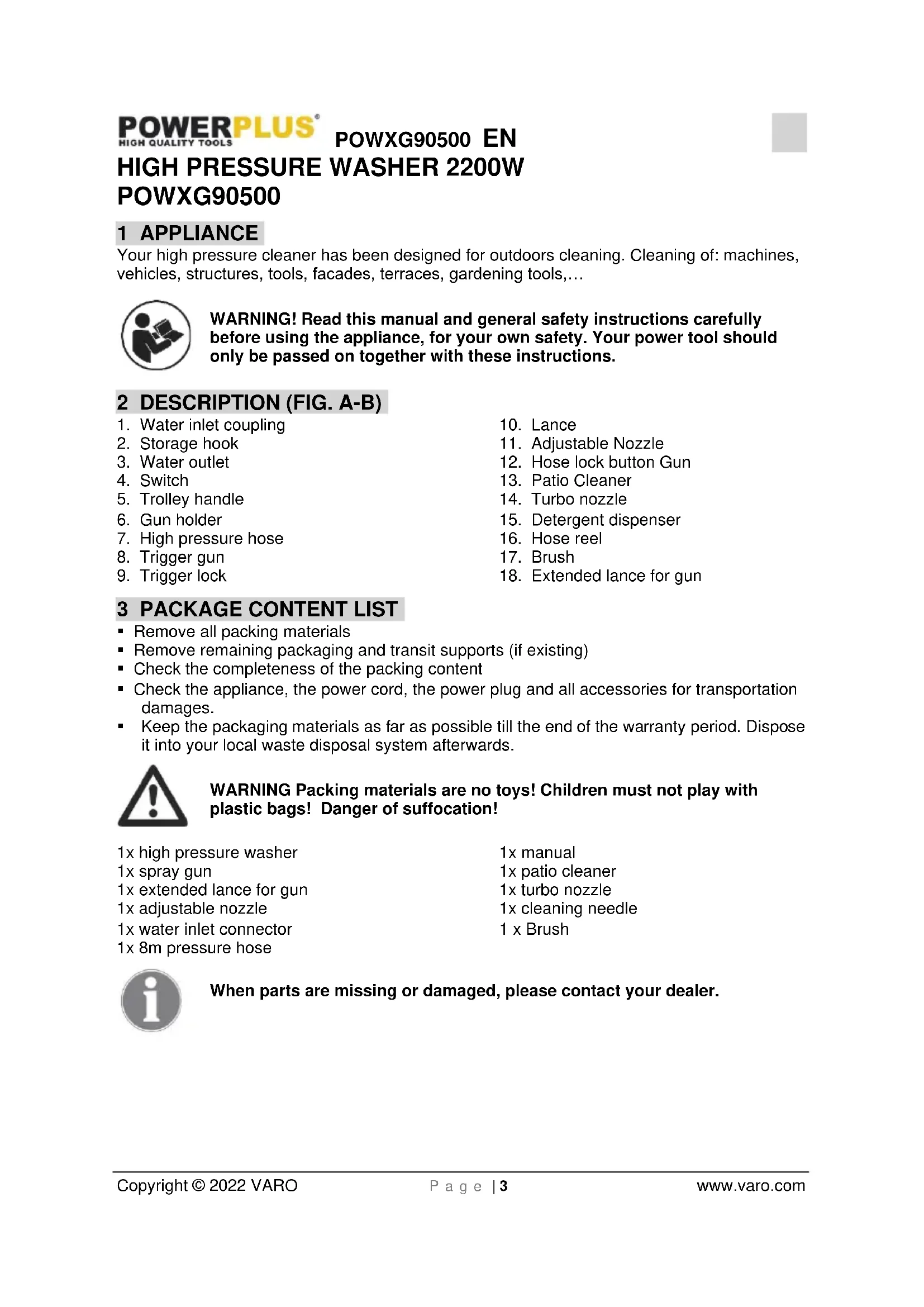 Download the instructions for your Pressure washer in PDF format for free! Find your manual POWXG90500 - PowerPlus and take your electronic device back in hand. On this page are published all the documents necessary for the use of your device. POWXG90500 by PowerPlus.