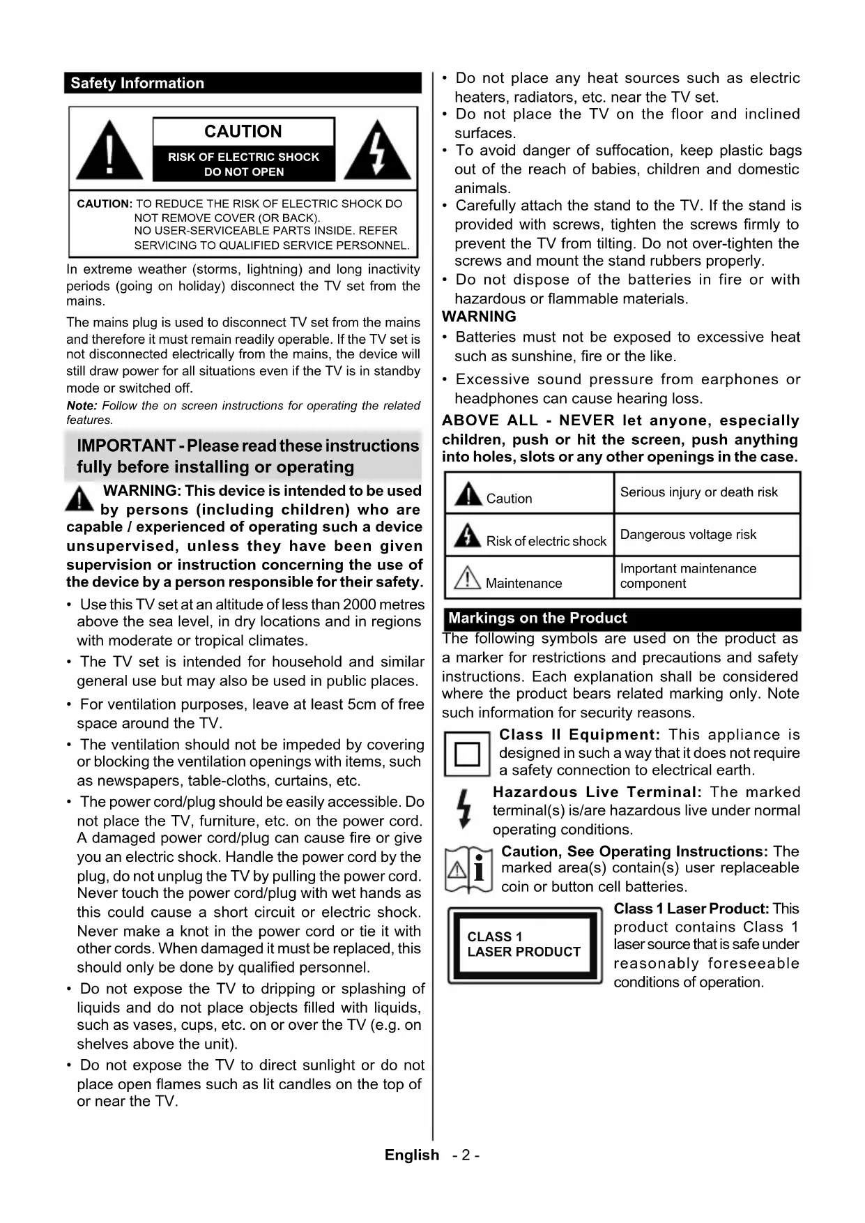 - Excessive sound pressure from earphones or headphones can cause hearing loss. ABOVE ALL - NEVER let anyone, especially children, push or hit the screen, push anything into holes, slots or any other openings in the case. Caution Serious injury or death risk Risk of electric shock Dangerous voltage risk Maintenance Important maintenance component Markings on the Product The following symbols are used on the product as a marker for restrictions and precautions and safety instructions. Each explanation shall be considered where the product bears related marking only. Note such information for security reasons. Class II Equipment: This appliance is designed in such a way that it does not require a safety connection to electrical earth. Hazardous Live Terminal: The marked terminal(s) is/are hazardous live under normal operating conditions.