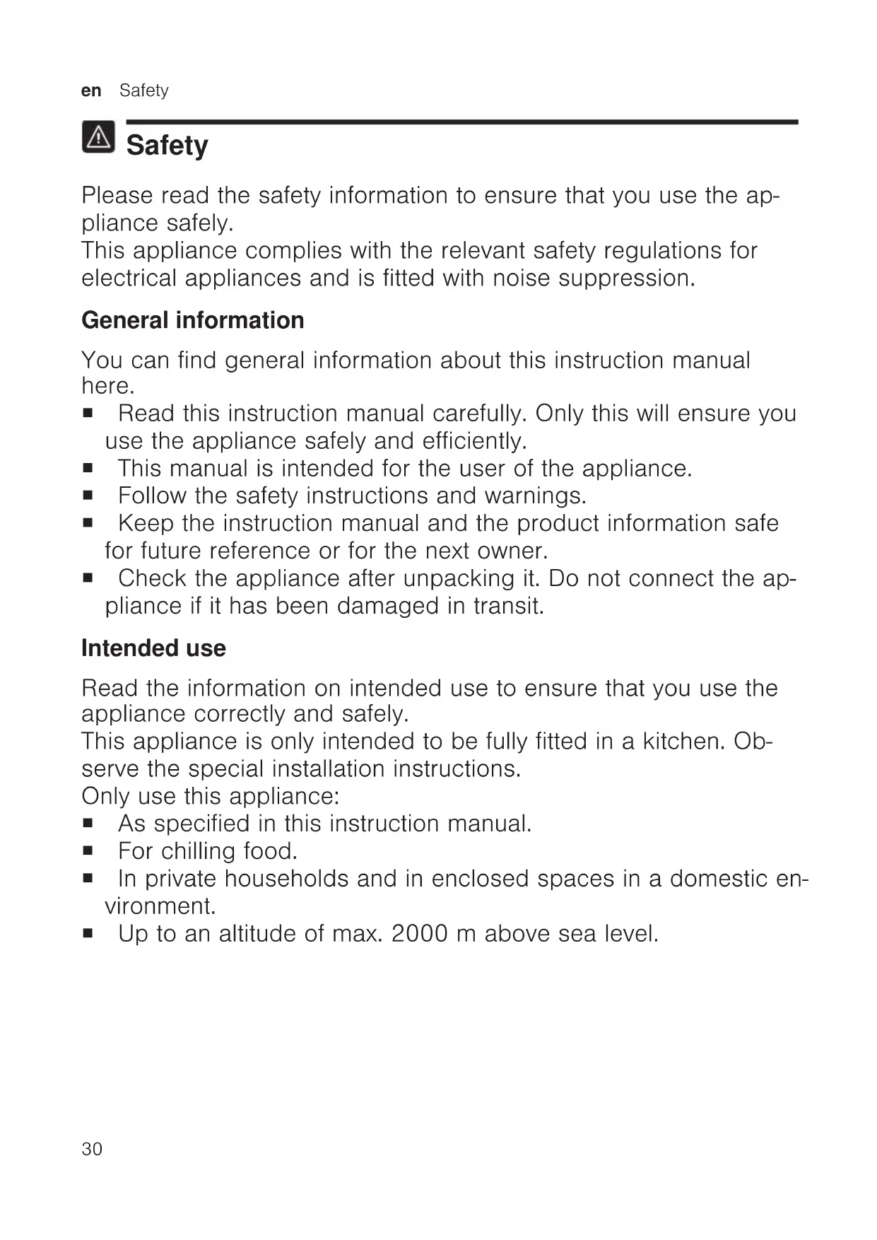 Safety Please read the safety information to ensure that you use the ap- pliance safely. This appliance complies with the relevant safety regulations for electrical appliances and is fitted with noise suppression. General information You can find general information about this instruction manual here. ¡ Read this instruction manual carefully. Only this will ensure you use the appliance safely and efficiently. ¡ This manual is intended for the user of the appliance. ¡ Follow the safety instructions and warnings. ¡ Keep the instruction manual and the product information safe for future reference or for the next owner. ¡ Check the appliance after unpacking it. Do not connect the ap- pliance if it has been damaged in transit. Intended use Read the information on intended use to ensure that you use the appliance correctly and safely. This appliance is only intended to be fully fitted in a kitchen. Ob- serve the special installation instructions. Only use this appliance: ¡ As specified in this instruction manual. ¡ For chilling food. ¡ In private households and in enclosed spaces in a domestic en- vironment. ¡ Up to an altitude of max. 2000m above sea level.Safety en