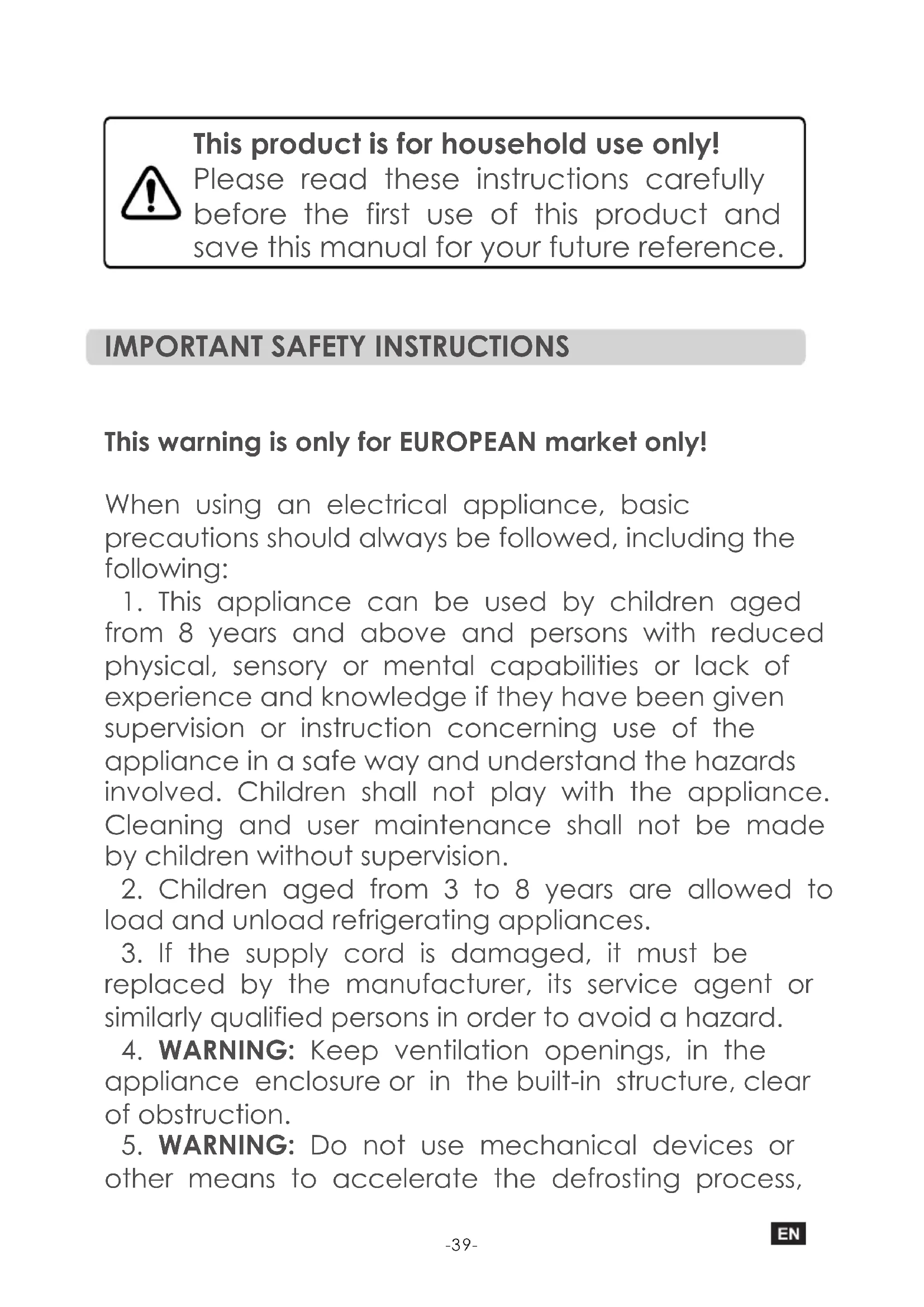 other means to accelerate the defrosting process, -39-o t h e r t h a n t h o s e r e c o m m e n d e d b y t h e manufacturer.